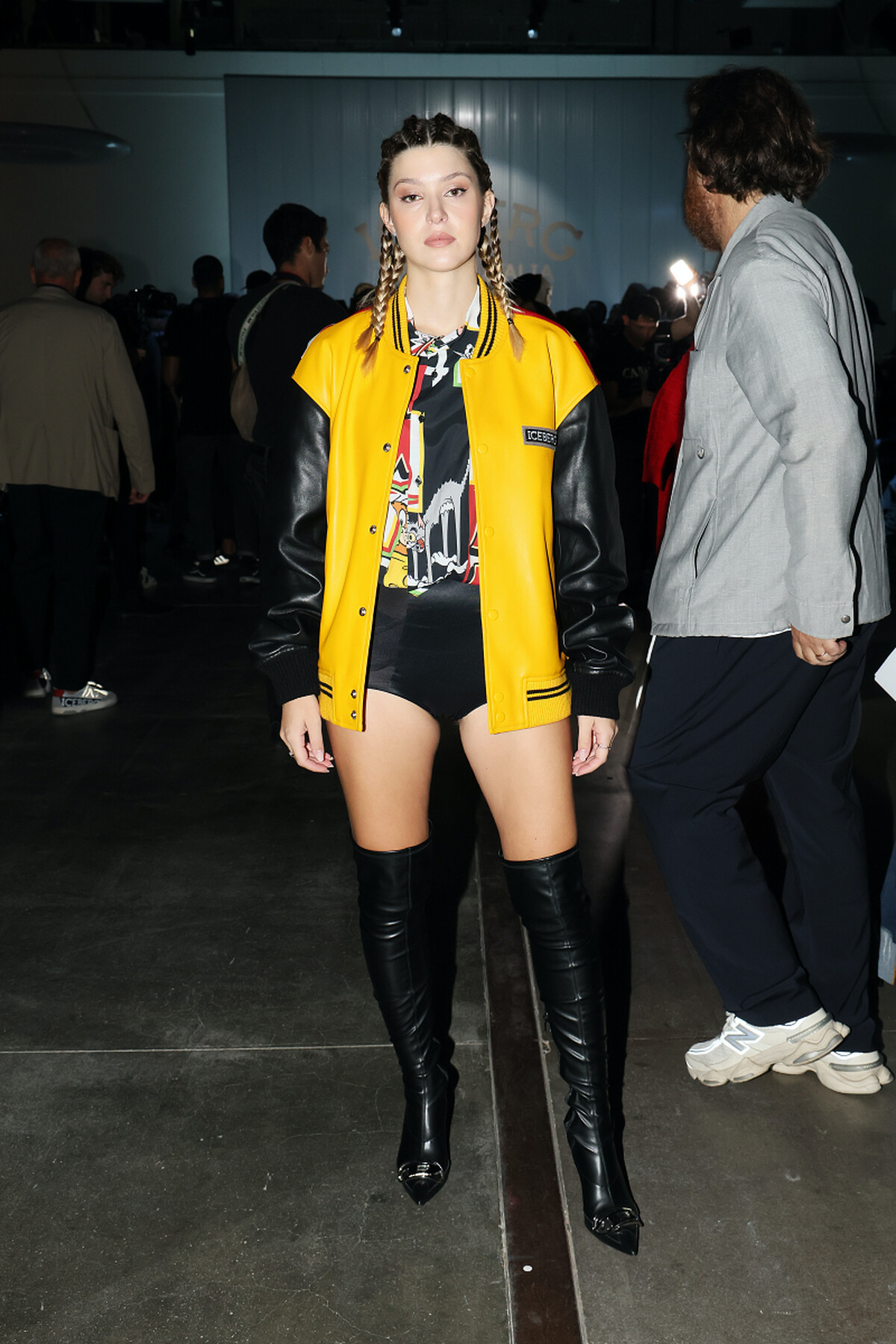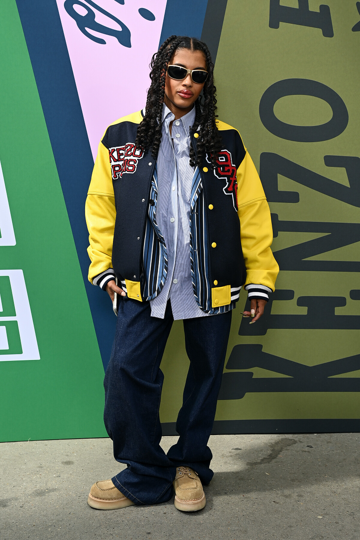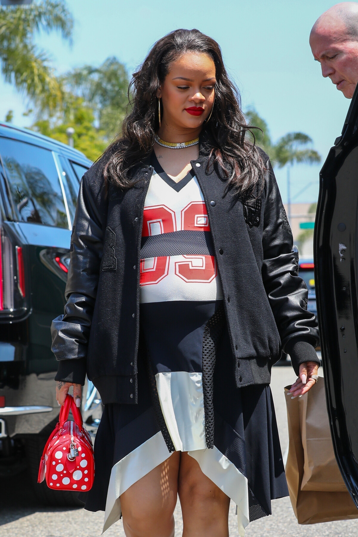 蕾哈娜以橄欖球造型的短洋裝搭配上棒球外套,將校隊風格轉化成時髦的街頭女孩感。