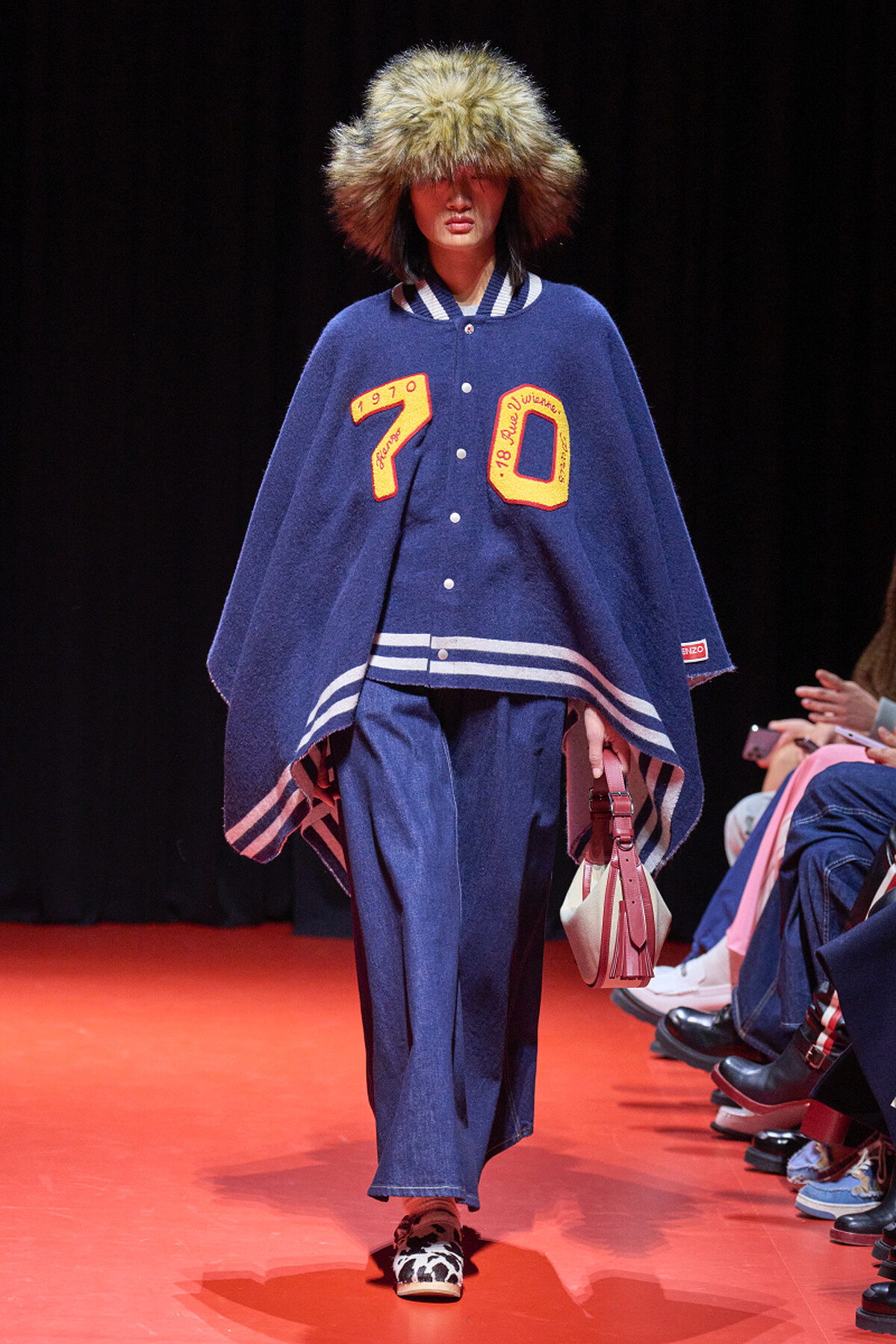 汲取棒球外套的細節元素,改以斗篷式剪裁的棒球外套,可以在穿搭中加入新鮮感。