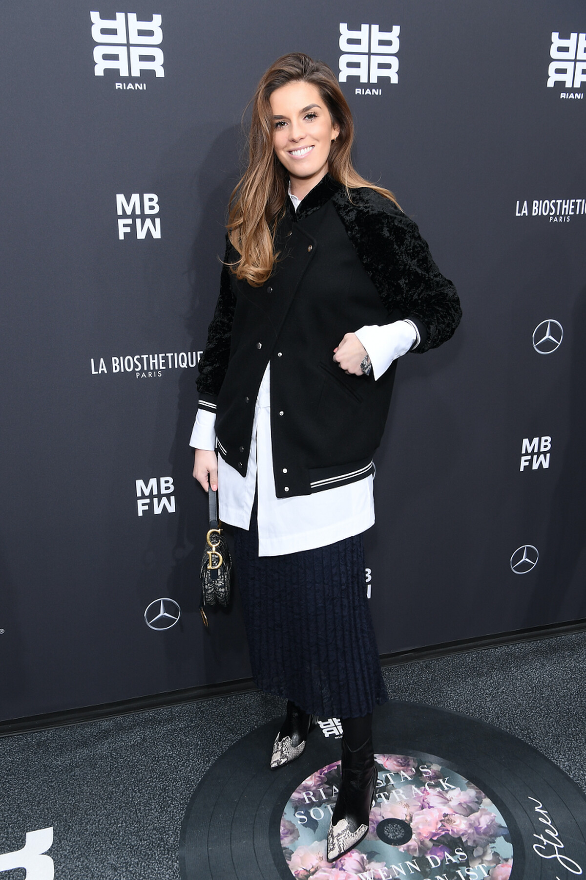 女性柔美感的印花搭配上中性風格的棒球外套,展現率性的造型感。