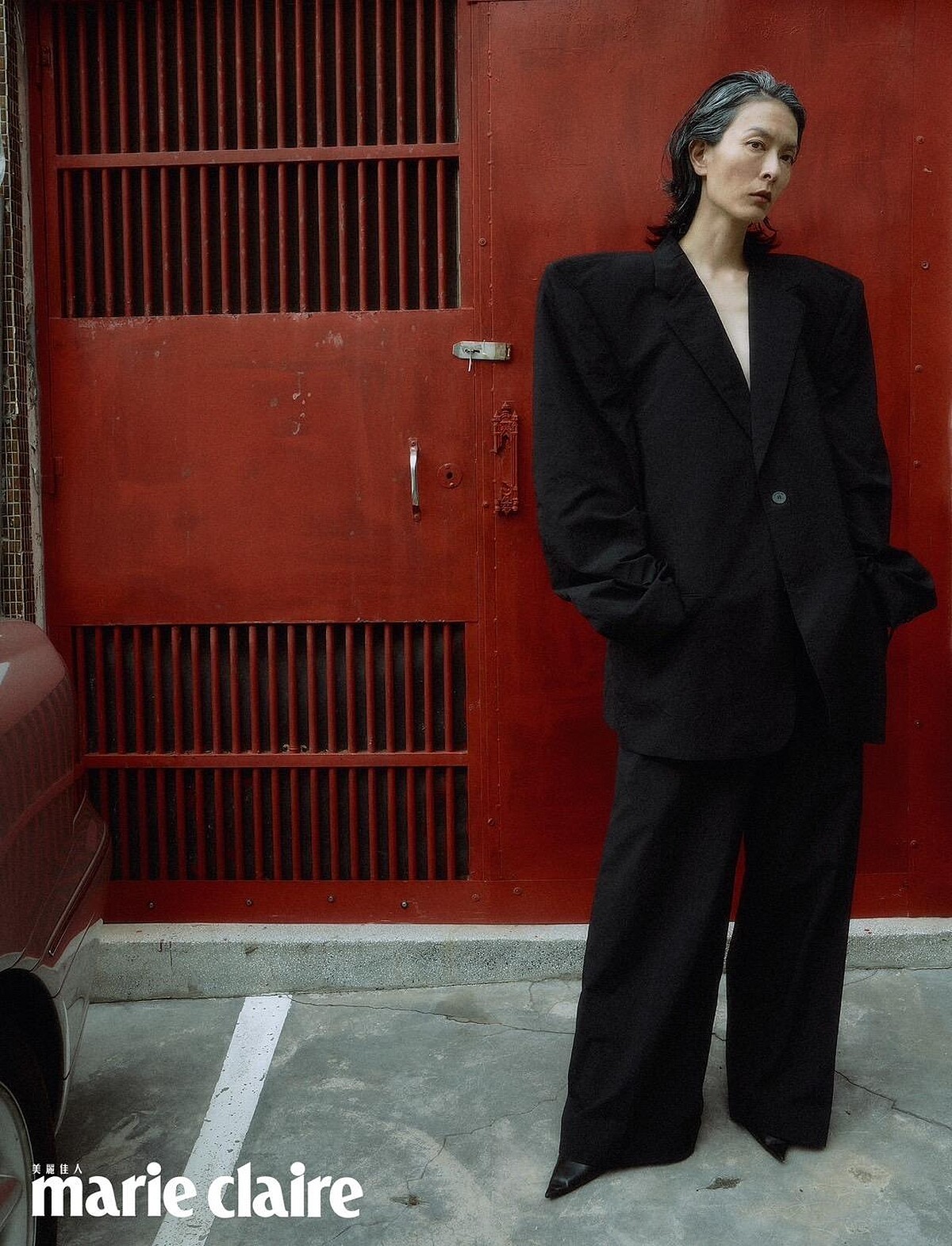 黑色寬鬆西裝外套、黑色寬鬆西裝長褲、黑色尖頭高跟鞋,all by Balenciaga。