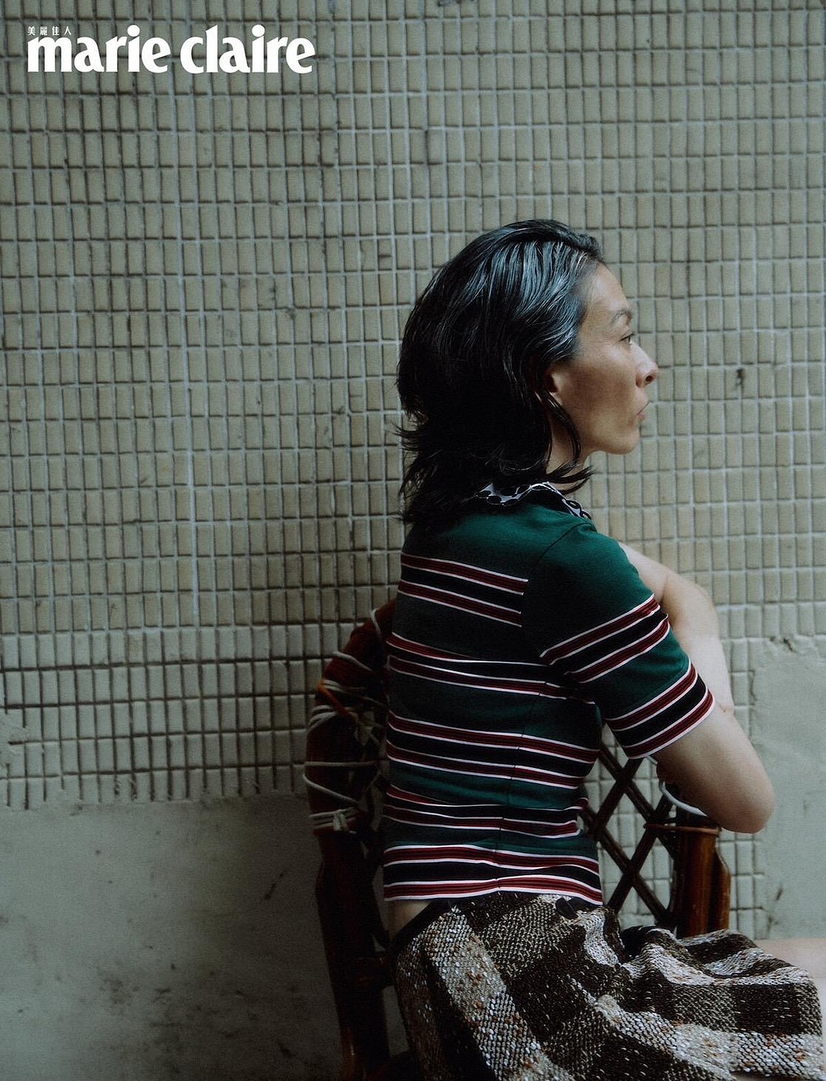 刺繡衣領條紋針織上衣、格紋粗呢半截裙,both by Louis Vuitton。