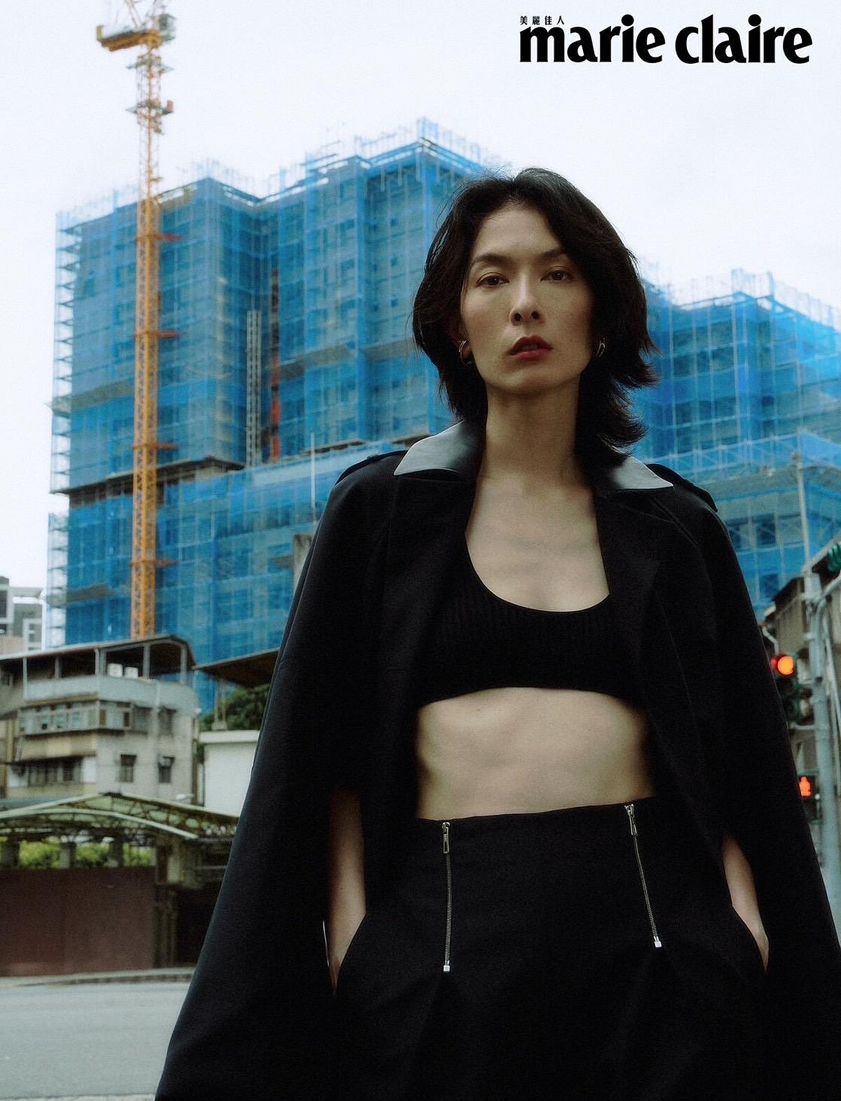 藍黑色披風式外套、藍黑色上衣、藍黑色雙拉鍊長褲、純銀耳環,all by Hermès。