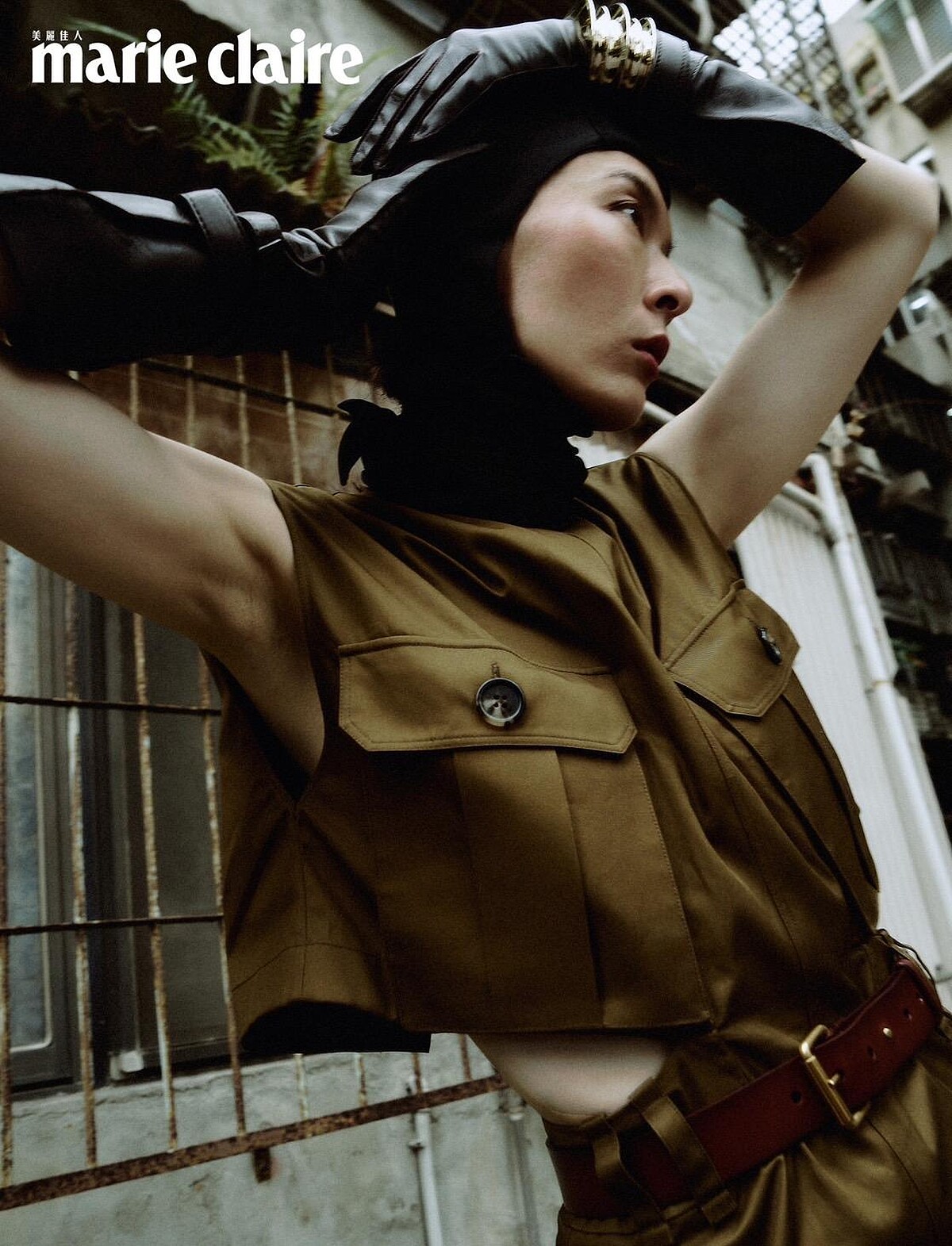 皮革帽飾、咖啡色鏤空連身裙、皮革飛行員手套、金色手環、皮革腰帶,all by Saint Laurent。