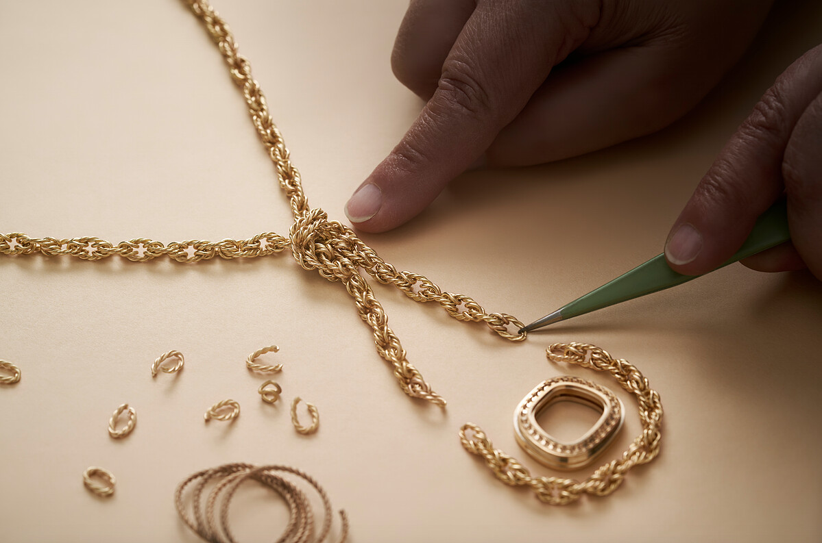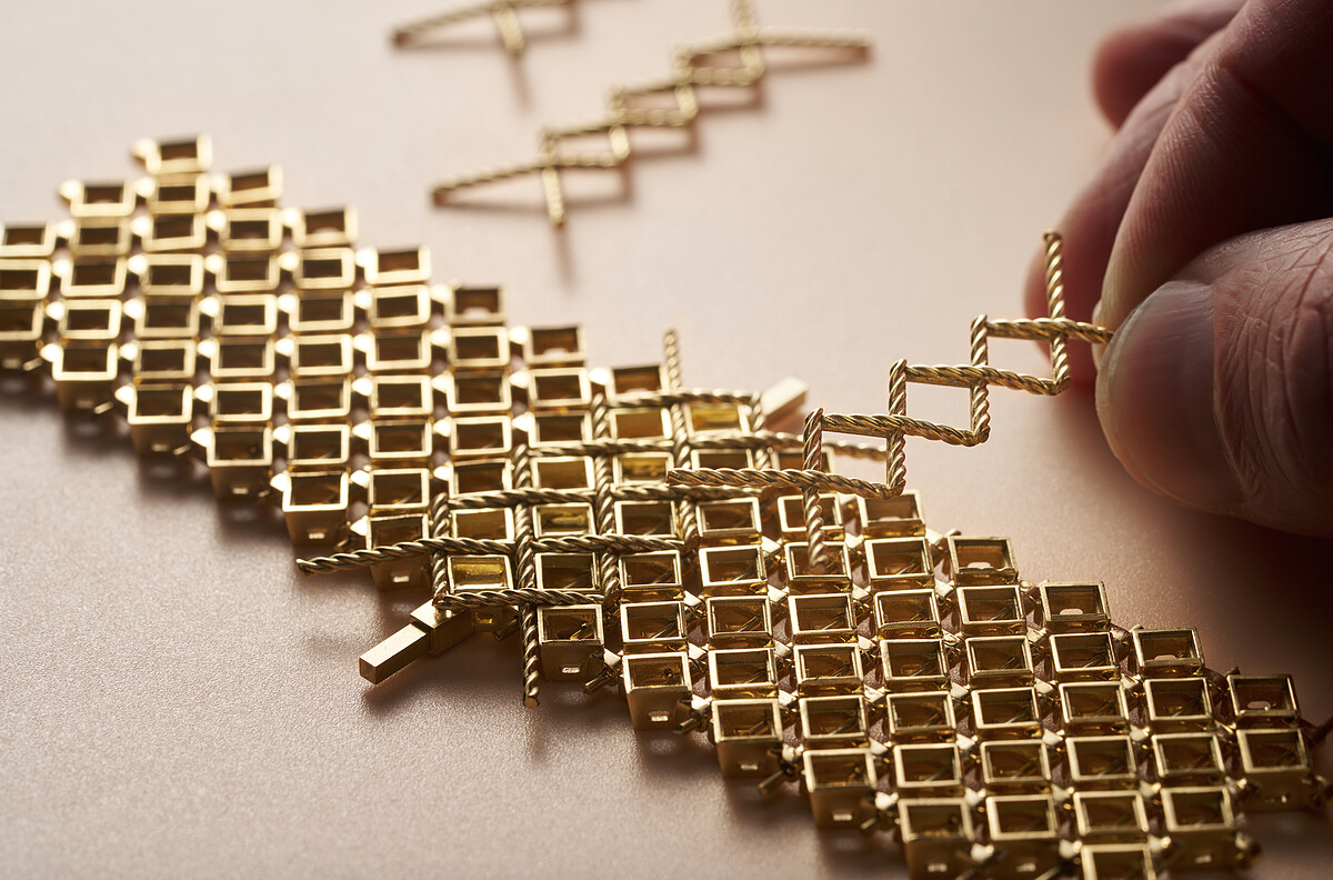 《Essence Of Extraleganza》最耀眼的金質元素是扭索編織金鍊。精製的金屬原料煥發光芒,在經過工匠巧手的扭製和細部拋光,呈現如絲線般的自由律動與光滑流暢,並注入一絲摩登復古的風格。它為紅玉髓、錳鋁榴石、黃色藍寶石和鑽石的項鍊織出主體,或為玫瑰金質螺旋鍊條項鍊和鑲有寶石的橢圓形吊墜「描繪」外框線條,或是,土耳其石珠長項鍊兩端妝點上金鍊流蘇,讓作品搖曳生姿的擺動感更為醒目;在一款鑲嵌40顆長方形切割哥倫比亞祖母綠的珠寶手鐲錶上,扭索編織金鍊隨著寶石串接,彰顯作品的立體層次。