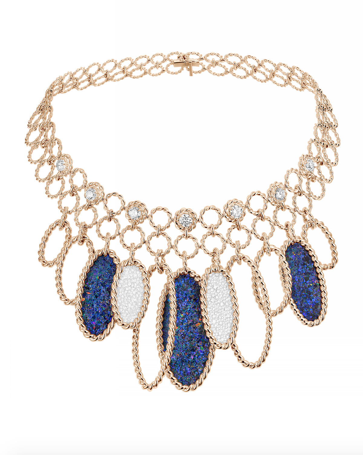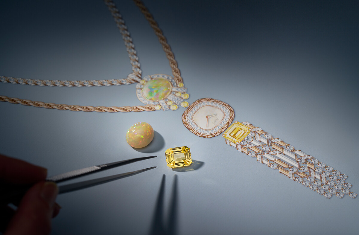 Yves Piaget 先生特別偏愛蛋白石,這種獨特晶透的有機寶石,因為具有彩虹光譜遊彩(play of color),像是自成一個小世界般的包容所有顏色,萬象繽紛,而 Piaget 的作品向來在設計形體上獨樹一職,加上蛋白石的奇特更添整體魅力。例如,一款 18K 玫瑰金鑲嵌黑蛋白石和鑽石的 Piaget Society 項鍊,下方大小和前後排列不一的橢圓圈環鑲嵌著蛋白石片,呼應鑽石鋪鑲和留白的圈環片,以自有的韻律為彼此的存在提升引色。
