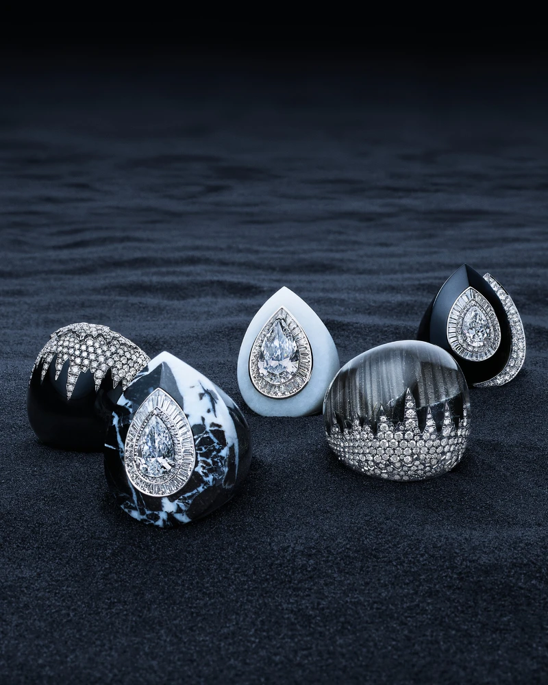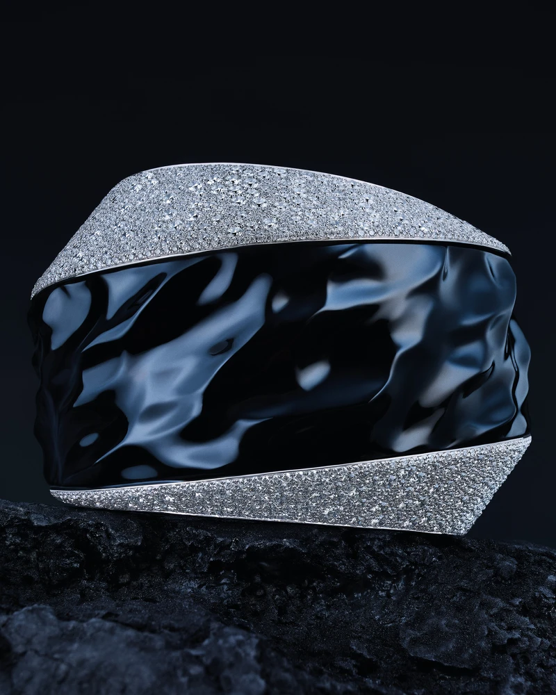 呈現水之美,《Or Bleu》也再一次探索「珍貴」的價値。來自海邊的黑沙用特殊 3D 列印技術和壓縮製程,引薦入頂級珠寶創作之中,擁有自然紋理的大理石透過手工雕刻和寶石點綴鑲嵌,是設計師眼中展現「摻有熔岩灰燼雜質的冰島浮冰」的絕佳素材,帶有玻璃晶透質感的火山黑曜石也幻化成鑽石手環和戒指的美麗細節。