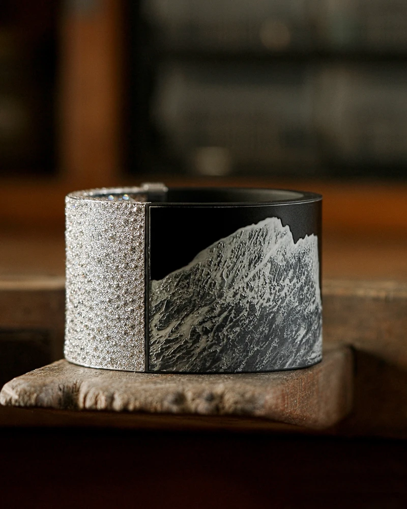 黑沙搭配18K白金密釘鑲嵌鑽石手環(套組另有項鍊與耳環),工時 900 小時。Boucheron 前一次首度於珠寶上使用沙子,是在2015年一款封裝著印度塔爾沙漠(Thar Desert)沙子的項鍊。本次手法大不相同,其概念大致上是透過 3D 列印技術進行壓實,原理是將黏合劑細緻且精確地噴塗到沙子上,使沙粒相互黏附、沉積成 1 毫米厚的薄薄沙層,摸起來能感受精緻的沙子顆粒,相當令人驚艷。