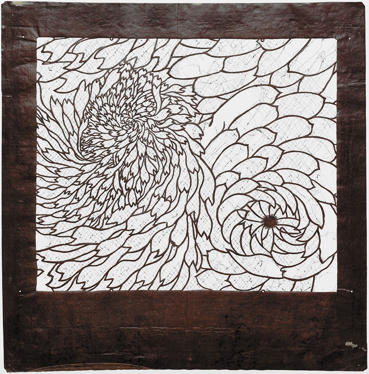 伊勢形紙(模板) 日本明治時代 (1868–1912 年), 19世紀末期 和紙剪裁、柿染和絲線 43 × 42.8 公分 巴黎裝飾藝術博物館