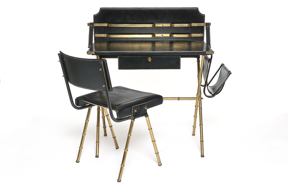 文件櫃與座椅成套的辦公桌 雅克.阿德內(Jacques Adnet),巴黎,約1950 年 仿皮、黃銅 書桌:100 × 93 × 55公分 書桌: 82 × 45 × 48 公分 巴黎裝飾藝術博物館