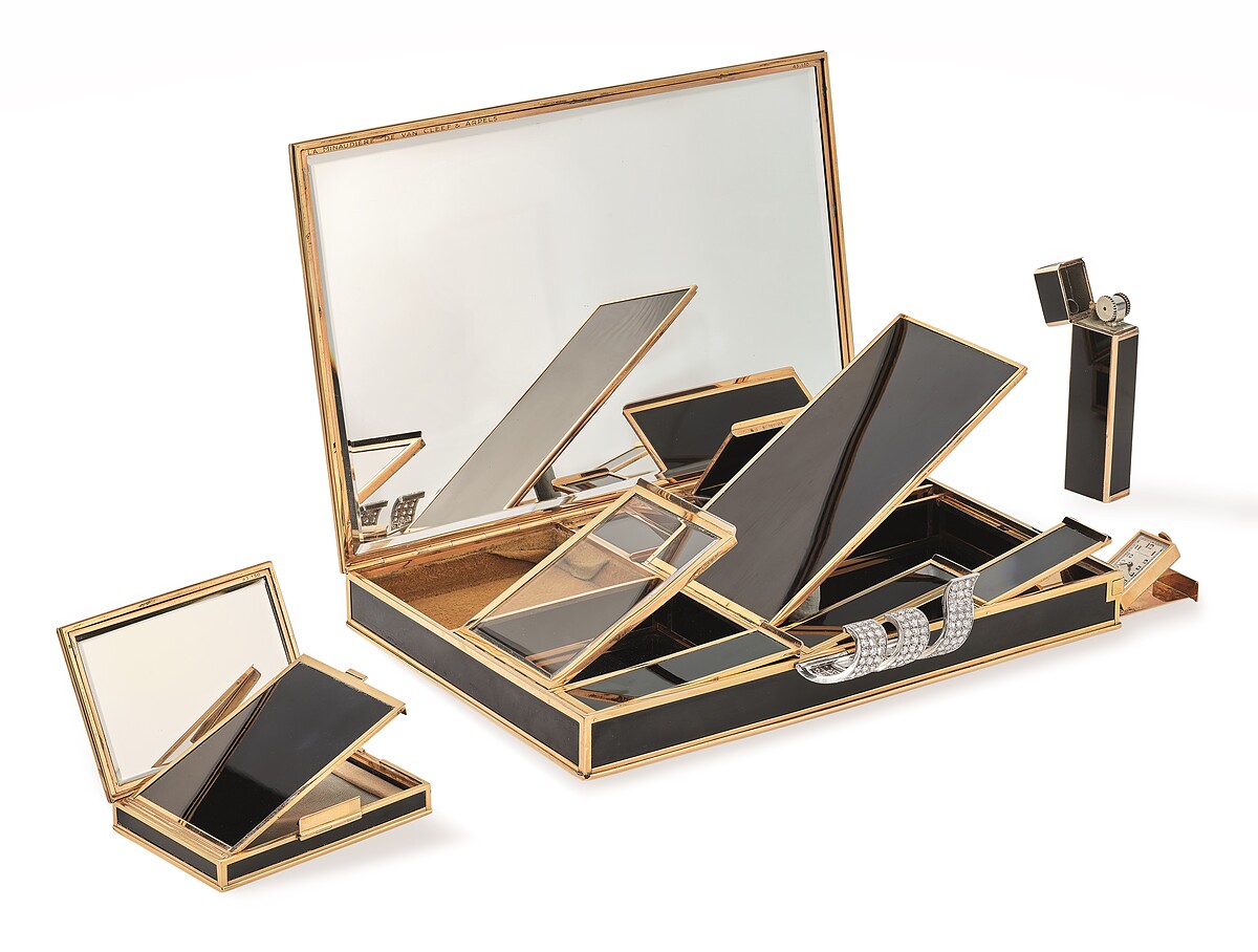 集美觀與實用於一身的「百什件」奇趣盒,反映出亞洲藝術影響(仿竹子竹節的裝飾細節)的成套文件櫃與座椅辦公桌,還有隱藏許多隔層,可收納粉餅、 唇膏、梳子、香煙⋯⋯在1933年獲得專利的百寶匣(Minaudière),總共28件各有奧妙玄機之處。