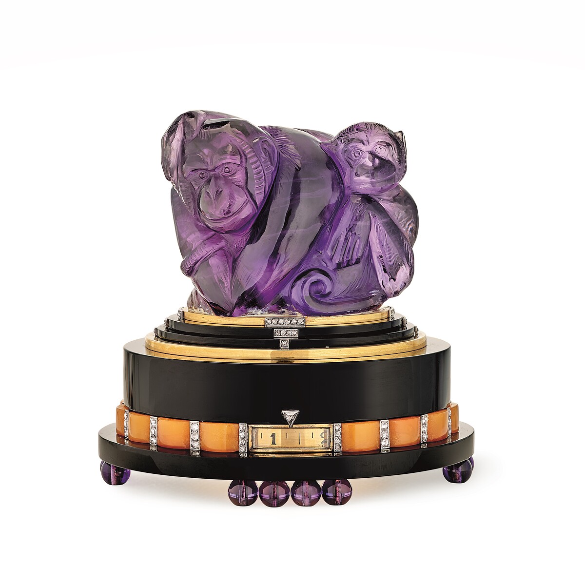 猴飾桌鐘 1926 年 鉑金、黃K金、紫水晶、縞瑪瑙、琥珀、鑽石 9.5 × 8 × 10.5 公分 Van Cleef & Arpels Collection