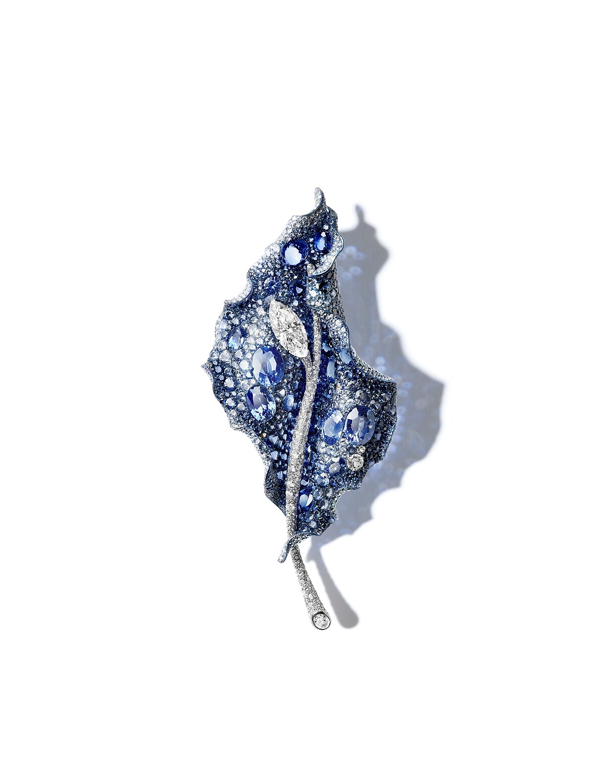 特別的是,一片葉子,別出心裁地揉入春夏秋冬,幻變流轉的四季於一體。此外,為了展現葉片在不同季節所呈現的面貌,另創作多款鈦金屬、18K金不同金屬素材與肖楠木複合材質,並靈活搭配運用白鑽、藍寶石、尖晶石、黃鑽、粉紅藍寶石、紅寶石、碧璽,根據所需再精選580顆至1793顆不等的多色彩寶,於僅有約莫1.77 公厘薄度的鈦金層上,全鑲排列出如繪畫般渲染效果,轉折幅度各異的葉片。執行上述製程的金工師平均有15年以上資歷,鑲嵌工匠資歷30年以上,技術上的繁複龐雜與極致程度不言可喻。為了四季葉子胸針,Cindy Chao 本次與12位匠師合作,光是前期作業時間就耗費三年,觀察各個季節的葉片形體,以便捕捉重現其皺折、光影、色彩等細節姿態。