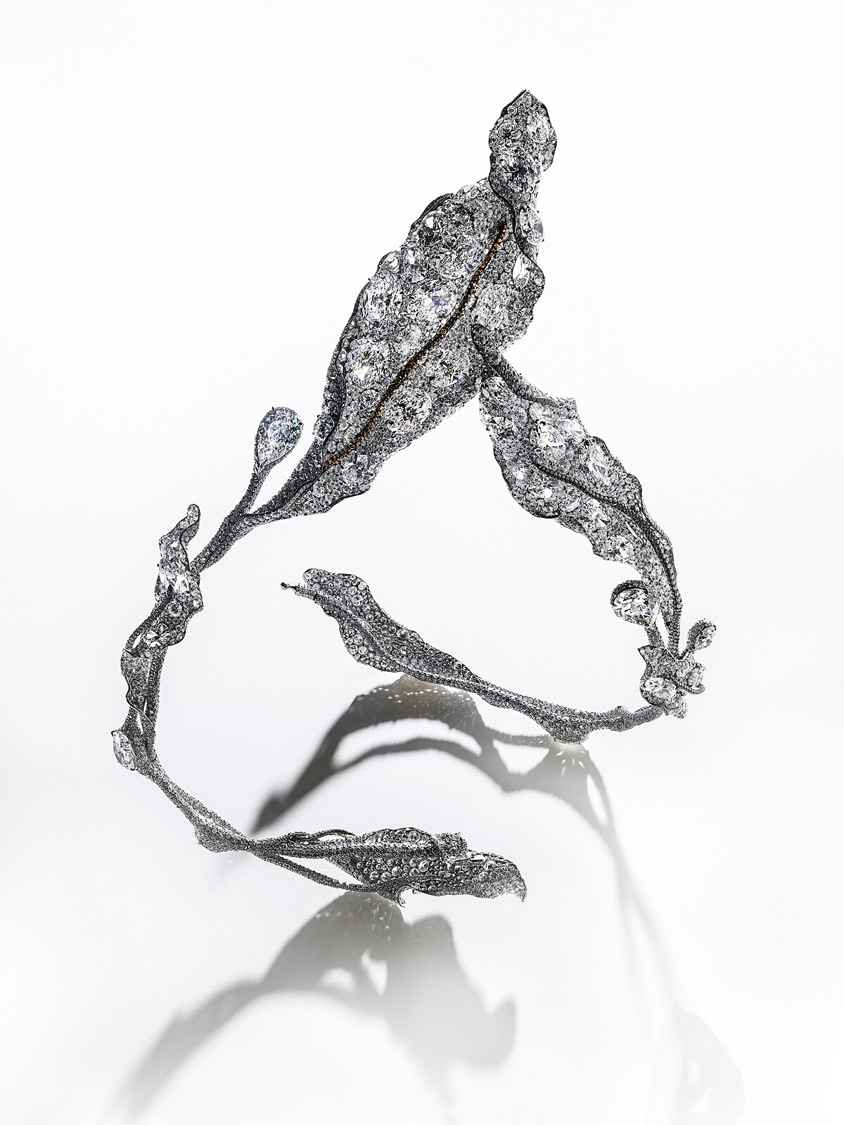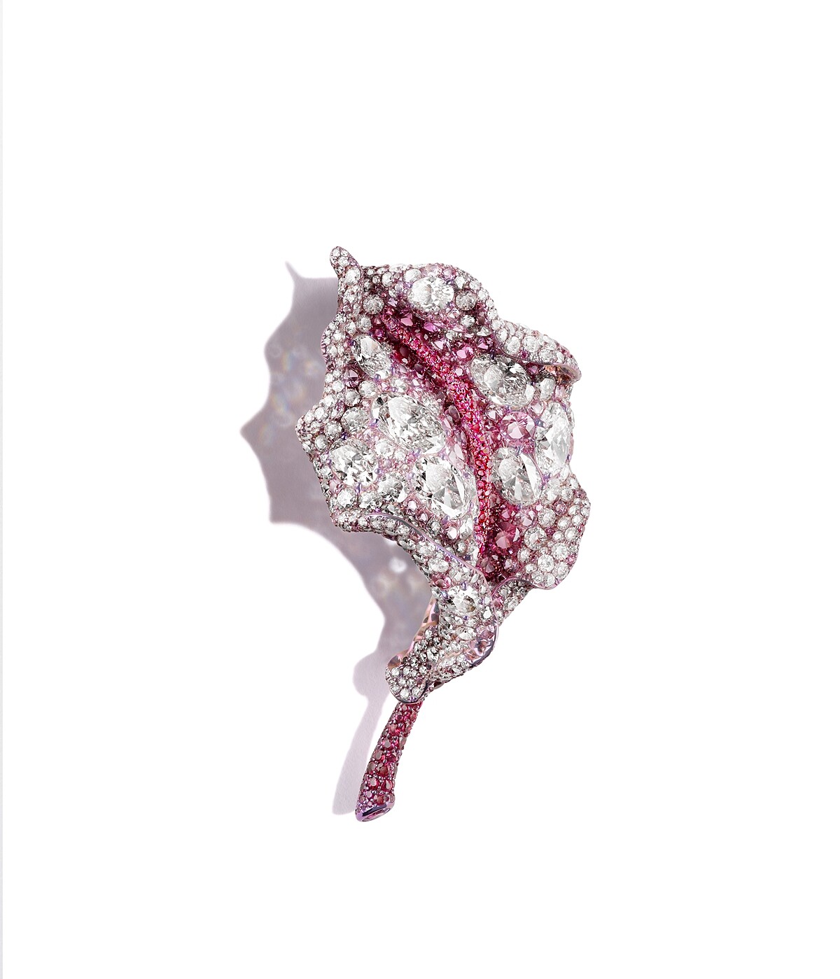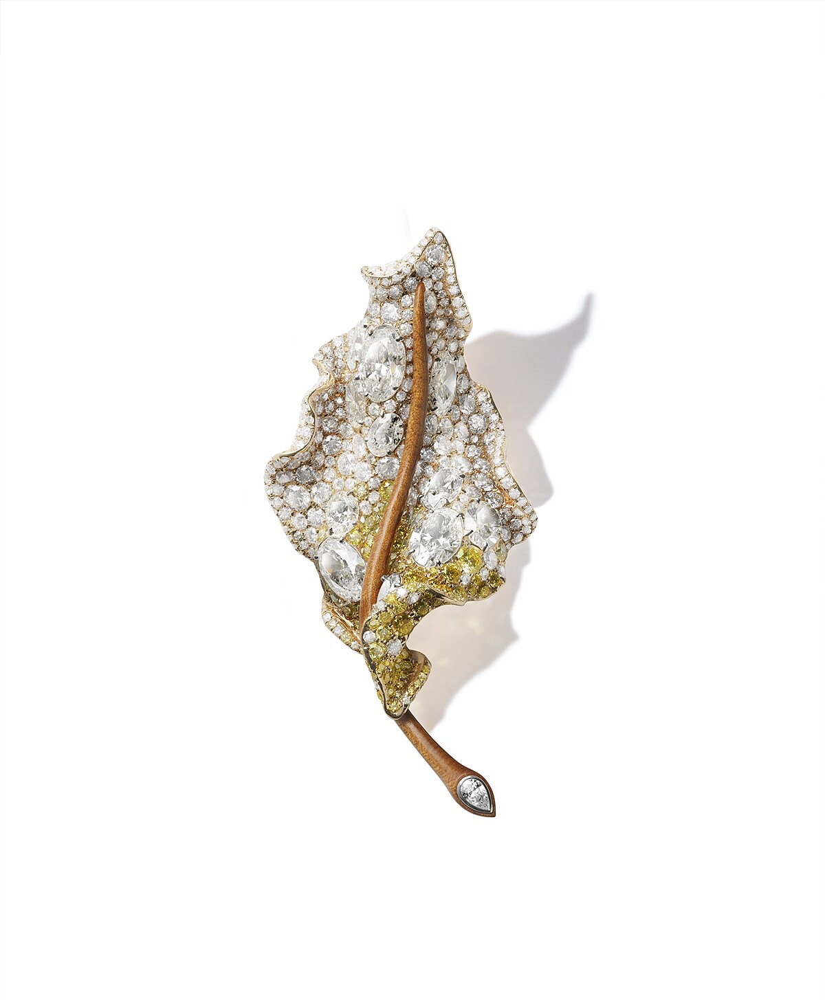 Cindy Chao 的最新胸針創作:深沈濃厚的黑,畫下葉子結構的中央一筆。從走向蜿蜒的葉梗向周邊擴散開來,是大大小小晶瑩的白色鑽石,所精心鋪排出,彷彿是結了層雪霜的亮澤表面。拉近仔細一看,底下透出微妙的綠色,最後,游移的視覺落在捲起的葉片頂端或是側邊,它們吐露著象徵生命的一片盎然綠色。這對來自趙心綺的手筆,從黑白色建構的寒冬意象,再蛻變成春日繁茂的色彩,將四季時光的流轉表露無遺,就像是珠寶藝術家個人20年來的風格歷程。