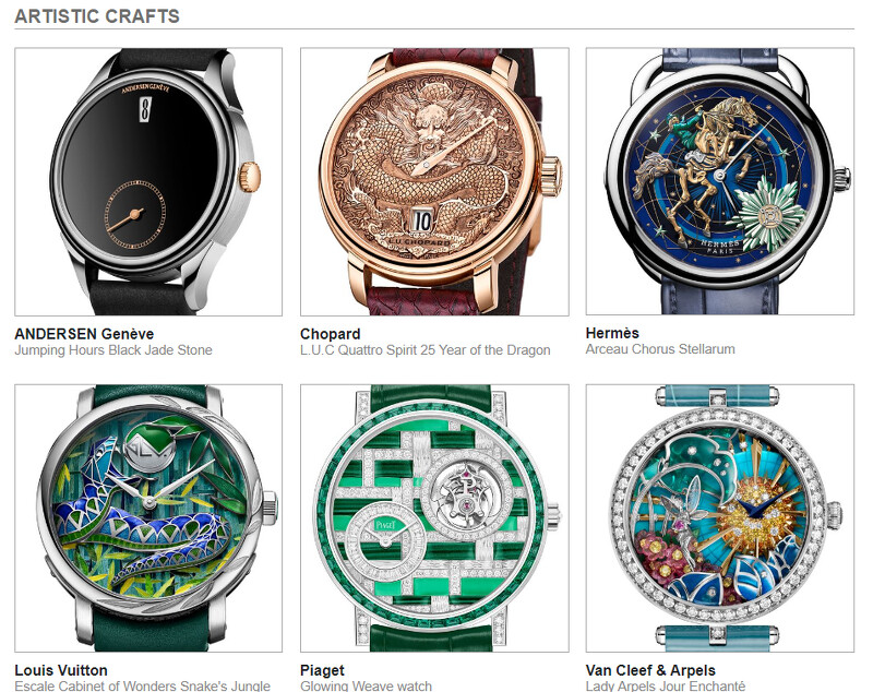 GPHG 也可見到越來越多的獨立製錶品牌,證明鐘錶賞析的廣度。Kazuo Maeda 品牌以精心設計的 Heures Universelles,為世界時區功能做出不於以往的詮釋;De Bethune 推出的 DB Kind Of Grande Complication,集結萬年曆、陀飛輪、瞬跳秒針、儲能指示和月相;來自 Franck Muller 的長方形黑綠配色跳時錶 Long Island Evolution Master Jumper;以及 ArtyA、Byrne,共同角逐男士複雜功能腕錶大賞。藉由琺瑯、嵌飾、彩繪、金雕等特殊裝飾手法,將工藝技術美感注入腕錶,這樣獨具藝術性和鑑賞樂趣的作品也相當值得關注。Louis Vuitton Escale Cabinet of Wonders Snake's Jungle 運用多種藝術工法,Hermès Arceau Chorus Stellarum 腕錶面盤結合精雕、鐫刻、轉印、彩繪等工藝,勾勒哥德風格騎士活動人偶的精緻細節