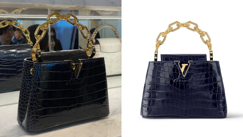 在處處華麗的展場中,這顆看似深沉如黑色的Capucines Mini手袋顯得低調許多,但它其實是今年度的焦點新作之一,此款包的皮革顏色就像黑夜一樣並不是純黑色,而是深邃的藍寶石色,上方堅挺的金屬提把則是Louis Vuitton首次嘗試的設計。