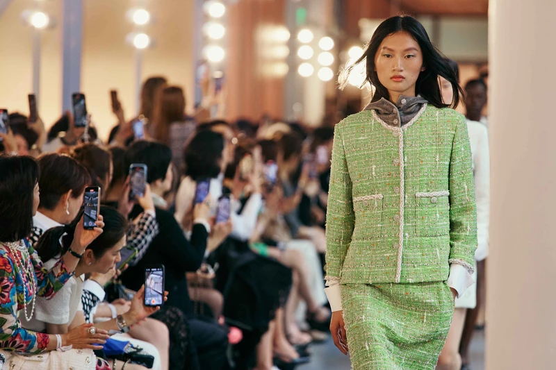 香奈兒對於服裝工藝的重視也體現在2024/25 Cruise 度假系列之中,茴香綠香奈兒套裝的外套充滿標誌性的視覺印象,綴以壓釦裝飾的潛水頭套也成為系列的亮點,六〇年代的衣領細節更帶出美好時光的雋永韻味。