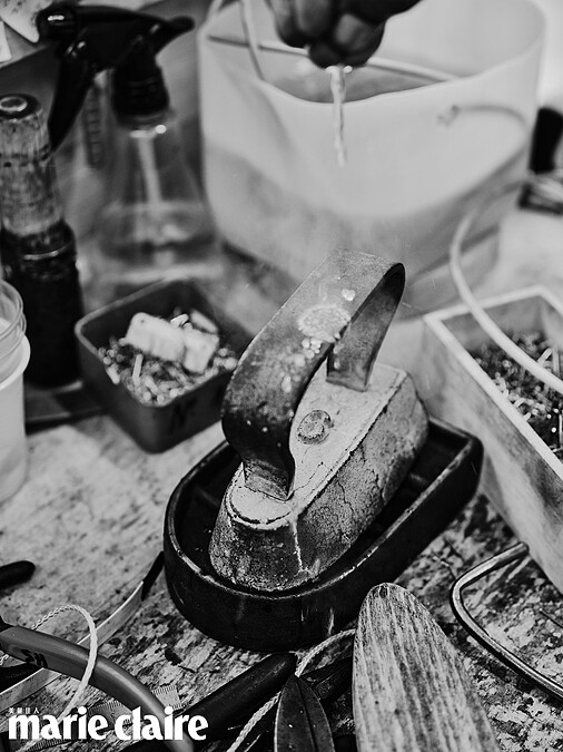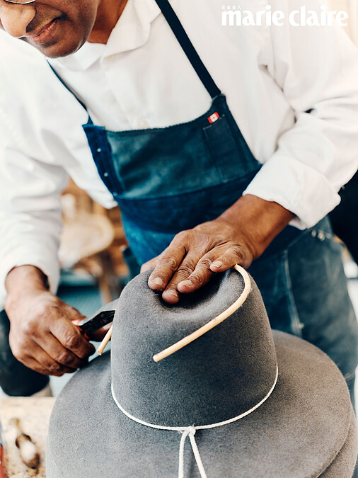 Priscilla Royer 一邊說明一邊示意讓工坊的帽匠示範給我們看,只見笑容可掬的帽匠雙手隨著蒸氣的節奏、底刷和敲擊鎚的聲音熟練地反覆來回動作、塑形,不過片刻,這款以毛氈為材料所雕刻出的精緻帽冠便完整的呈現於我們眼前,讓人忍不住驚嘆。Priscilla Royer 接著說道:「我最享受的是將傳統工藝與現代創意結合的過程。特別喜歡通過手工細節賦予帽子生命的過程,例如使用稀有材質或測試創新的技術,將原本簡單的想法轉化為一件有情感、有故事的作品。」