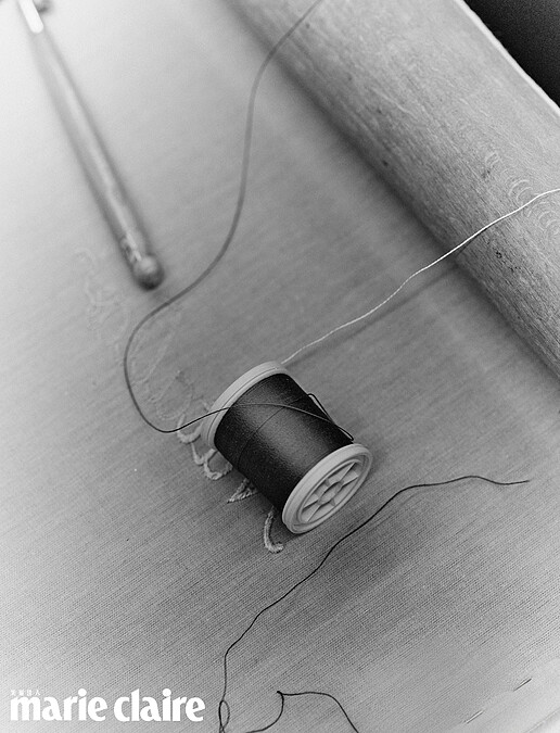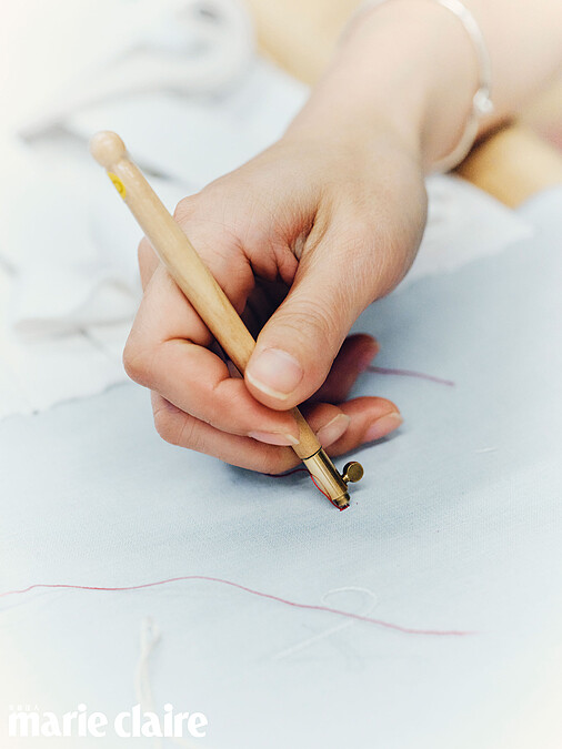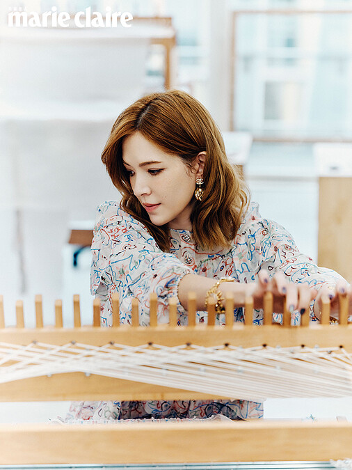 結束 Maison Michel 的巡禮後,我們沿著導覽的路線,穿梭於 Métiers d’Art 工坊大樓的寧靜走廊間。一路上,光影交錯,彷彿引領著我們邁入下一段奇妙旅程。途經一間間整理得井然有序的資料室與珍藏豐富的經典檔案庫,每一本手稿、每一件樣本都宛如珍貴的歷史秘笈,引發我們如同學子般的熱烈驚嘆。然而,真正的啟迪源於親身的參與與體驗。於是,在 Lesage 工坊織品設計師 Olena Pysarenko 親切又細膩的引導之下,許瑋甯化為工坊一日實習生,體驗實作的樂趣,只見瑋甯屏氣凝神地握著紡織機,專注又謹慎地依循設計師的說明,加上適時地調節速度與節奏,在一個指令一個動作之下完成紡織品的製作與工序。