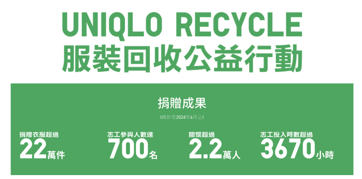 2.Uniqlo RE.UNIQLO 回收計劃:Uniqlo 鼓勵顧客回收舊的Uniqlo服飾,尤其是羽絨服等特殊材質,這些衣物會被重新加工或捐贈給更為需要的人。另外,部分地區會提供購物回饋券,或舉辦限時回饋活動,例如以折扣價換購新商品。
