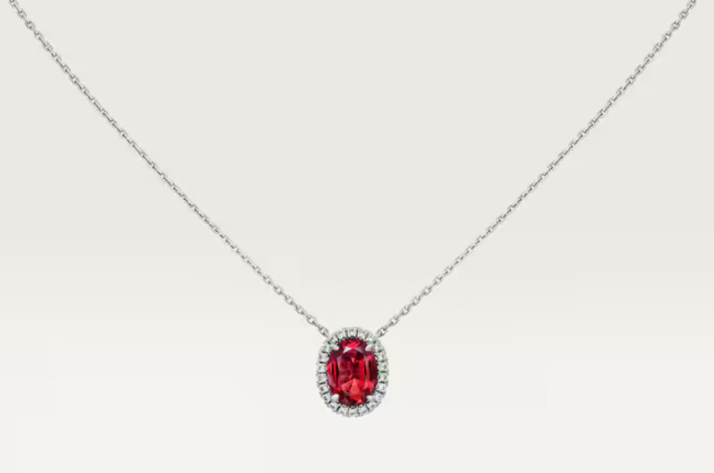 Cartier Destinée項鍊,750/1000白K金,鑲嵌一顆橢圓形切割紅寶石,備有1.00至1.99克拉紅寶石;並鋪鑲上圓形明亮式切割鑽石。(寶石的克拉重量和數量,將視實際訂購作品尺寸而異)