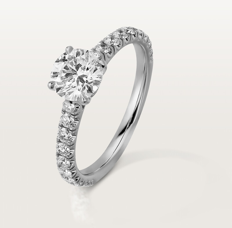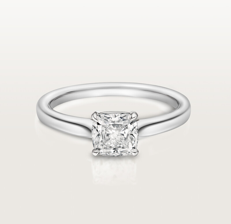 1895系列婚戒是卡地亞檔案記載中,第一次有鉑金訂婚戒指的年份。品牌鑽石戒指的無限創意就此展開,包括不同車工的單鑽、彩色寶石等等樣式變化,皆四枚鑲爪固定主石,鑲爪也完美對齊主石「菱紋」,純粹簡約的金屬線條帶出鏡面亮澤感,每處細節都是工藝。