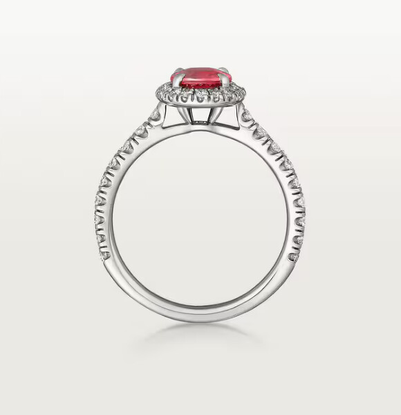 1895單鑽戒指,950/1000鉑金,鑲嵌一顆橢圓形切割紅寶石,備有1.00至1.99克拉紅寶石;並鋪鑲上圓形明亮式切割鑽石。(寶石的克拉重量和數量,將視實際訂購作品尺寸而異)
