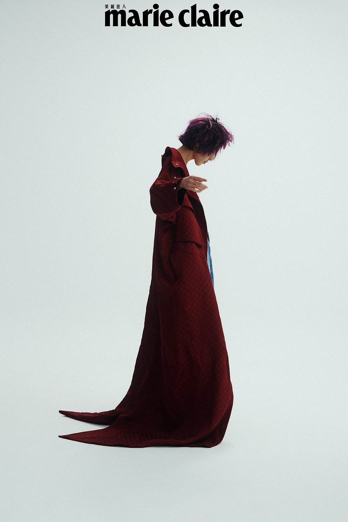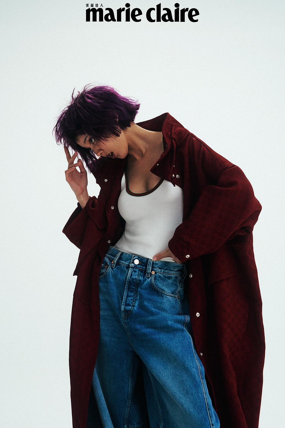 紅色緹花大衣、丹寧褲,both by Gucci。