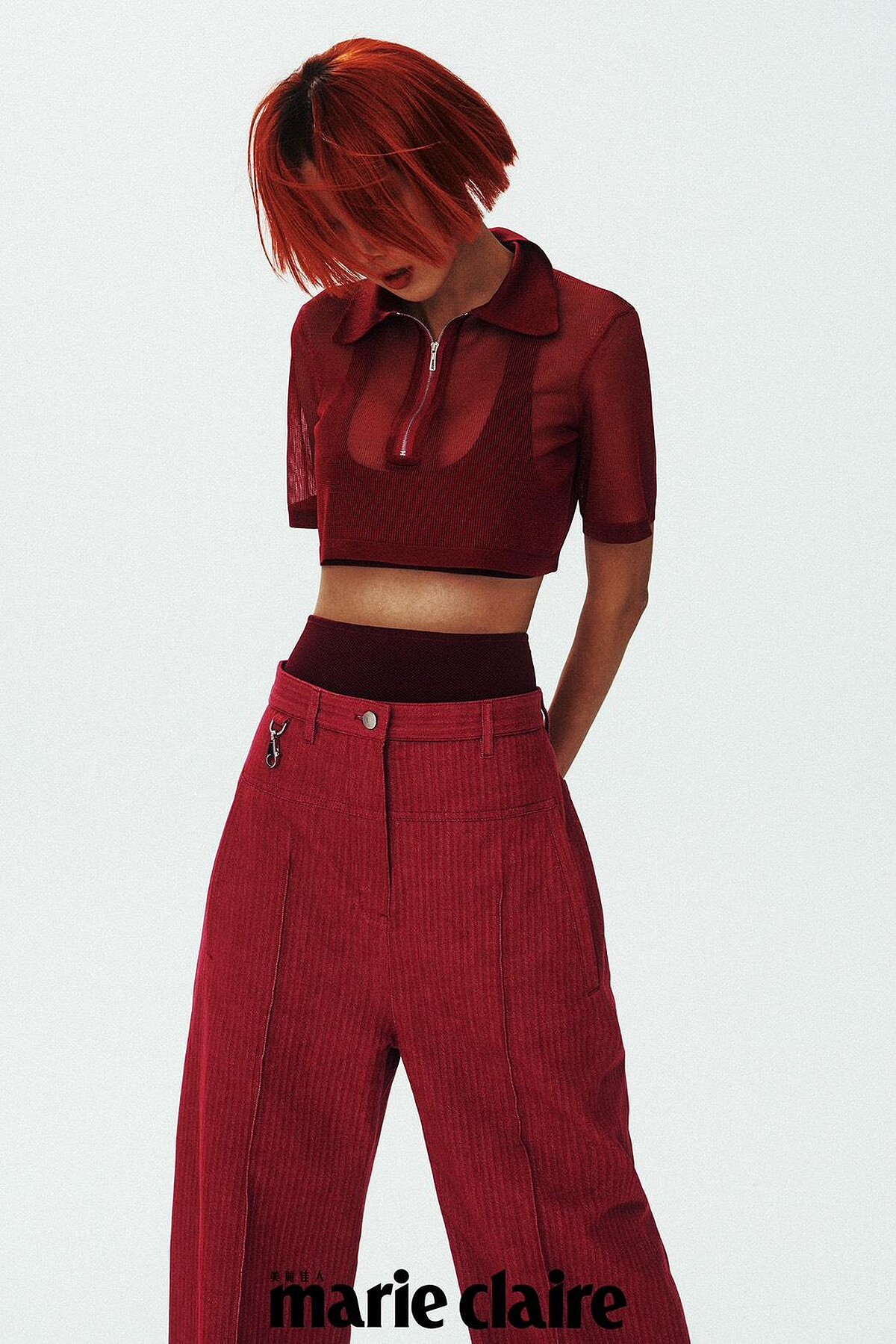 桃紅色網眼Polo衫、桃紅色背心、桃紅色內搭褲、桃紅色長褲,All by Hermès;酒紅色鉚釘高跟鞋,Gucci。