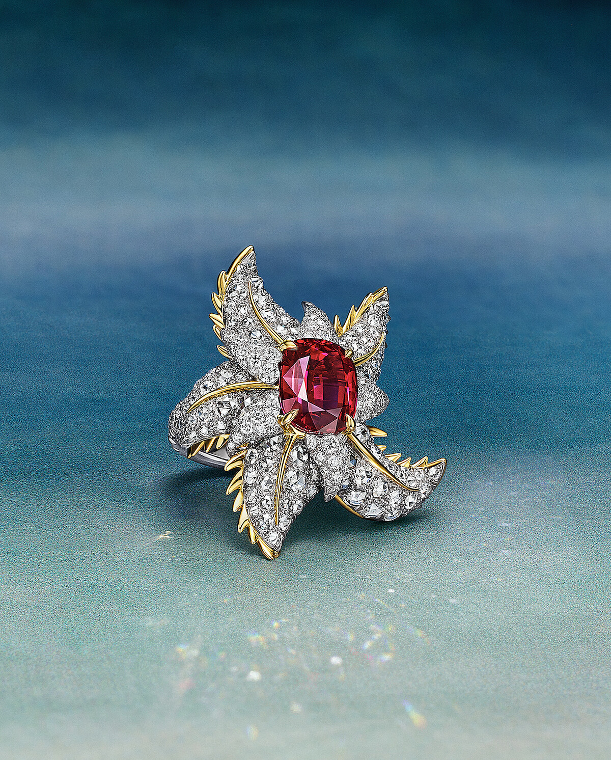 2025 Blue Book 高級珠寶 Sea of Wonder—Starfish 系列 鉑金與黃 K 金鑲嵌主石逾 6 克拉未經優化處理的枕形 切割紅寶石與鑽石戒指