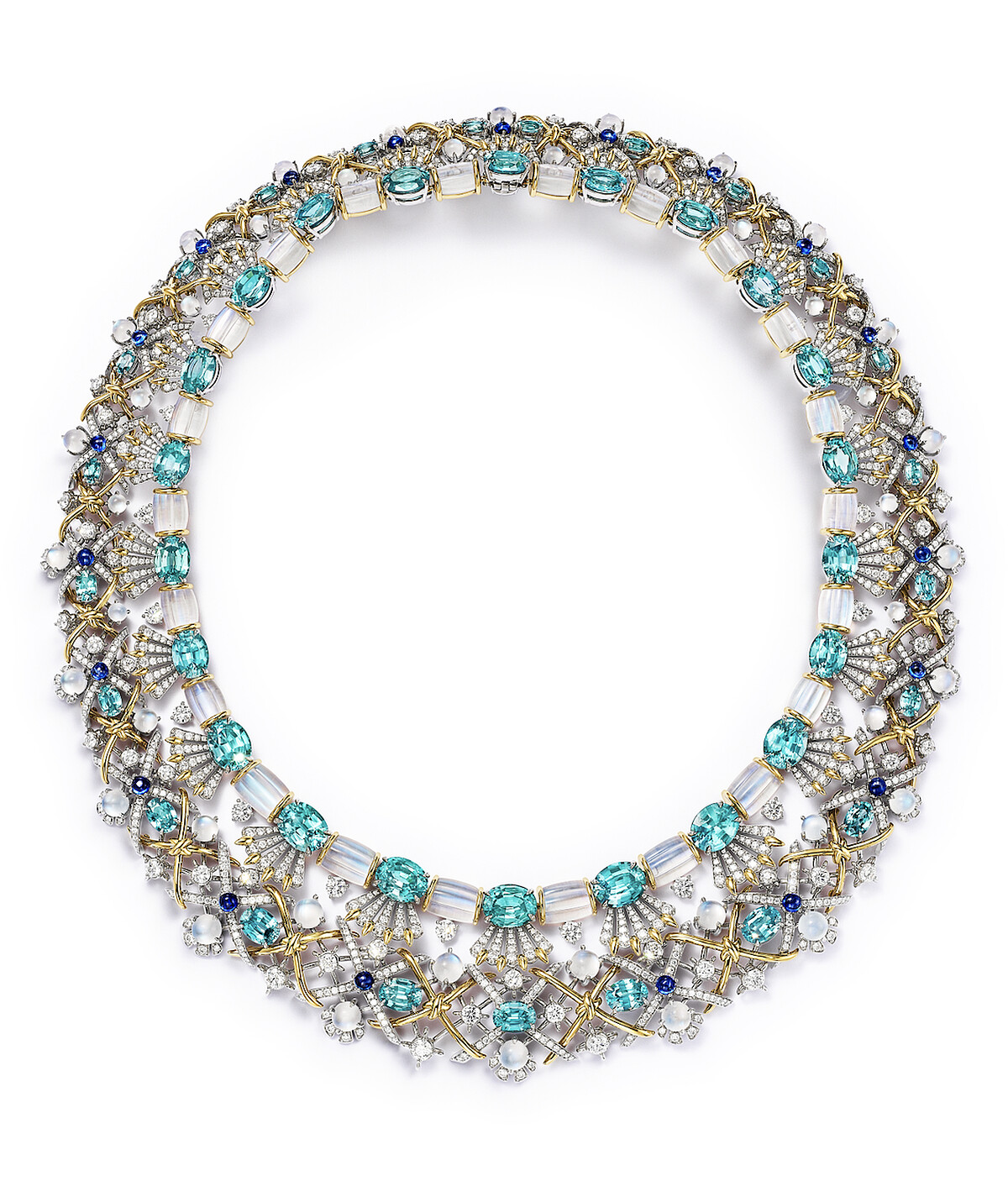 2025 Blue Book高級珠寶Sea of Wonder—Seahorse系列_鉑金與黃K金鑲嵌總重逾83克拉的藍色風信子石、藍寶石、月光石與鑽石項鍊