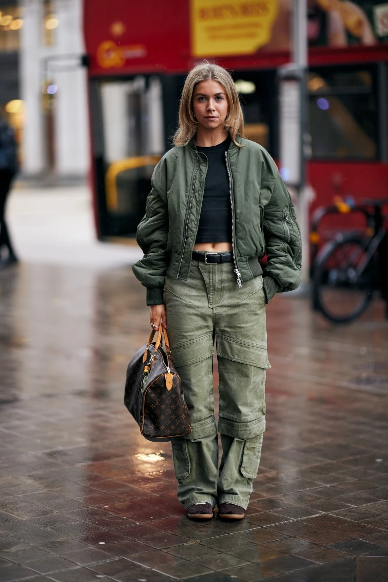 以中性Boyish的風格穿出工裝褲的帥氣,因為飛行外套已經很有份量感,建議內搭精簡即可。