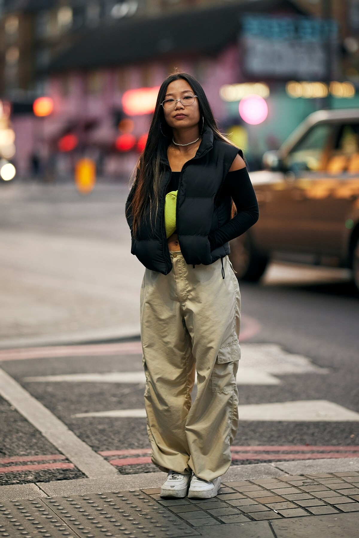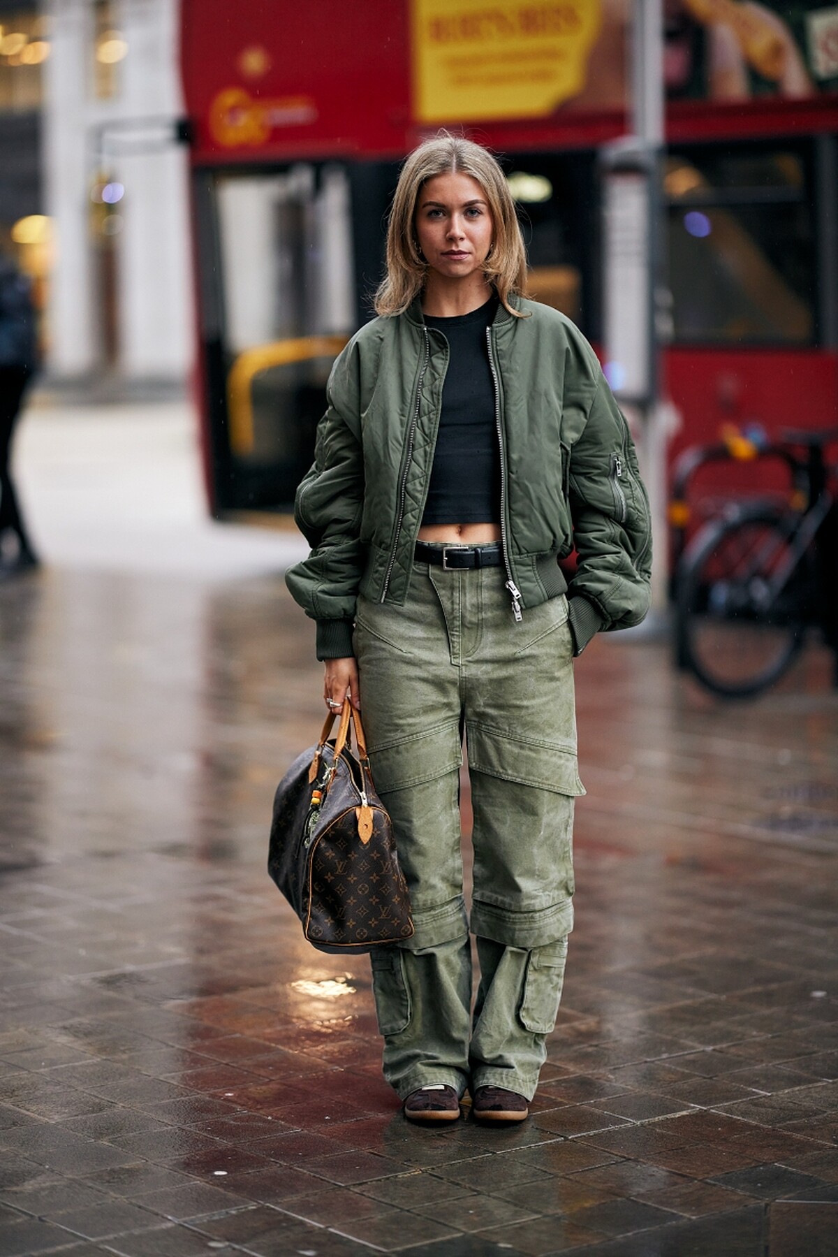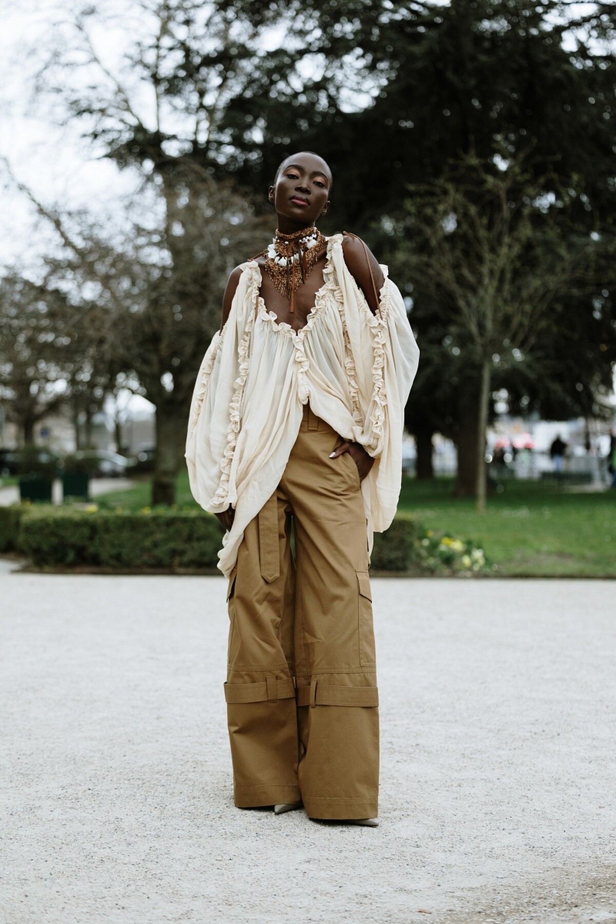 許多工裝褲會在褲腳加入束口設計,這不僅有助於修飾腿部比例,也讓搭配鞋款更具變化性,從休閒鞋、靴子到高跟鞋都能完美銜接。材質方面則多選用重磅斜紋布、帆布或厚棉,這些布料不僅耐穿,還能撐起整體褲型輪廓,讓穿著更有份量感。