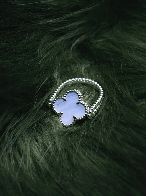 本次推出兩款 Vintage Alhambra 雙面戒指:18K白金鑲嵌玉髓、18K玫瑰金鑲嵌灰色珍珠母貝。戒環由三行大小排列有致的金質圓珠組成,上手感受極佳同時綻放美感。圖騰兩側以活動鉸件固定,能於寶石、中央鑲鑽的金屬璣鏤雕刻,之間穩定流暢地翻轉變換。