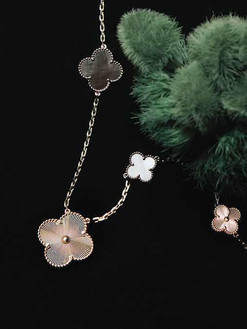 四葉草圖騰大小的選擇,與多種寶石之間的搭配也是一大細節亮點。此款 Magic Alhambra 長項鍊飾有總數15枚,大小不一的灰色及白色珍珠母貝,與以璣鏤刻紋綻放光采的金質。這之間的排列分佈、鍊節間距,除了美感表現,更需全面考量作品的垂墜感和平衡性。