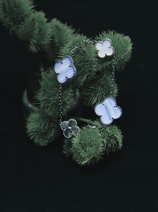 新品帶來的第二種寶石搭配,是18K白金鑲嵌玉髓及白色珍珠母貝,微妙藍調暉映母貝微光,更顯清秀靜謐,再以璣鏤雕刻添加閃光。此四枚手鍊轉換自Magic Alhambra 長項鍊——用於轉換形態的扣環巧妙藏於長項鍊頸後,也代表項鍊能以兩種不同長度變換、穿戴。