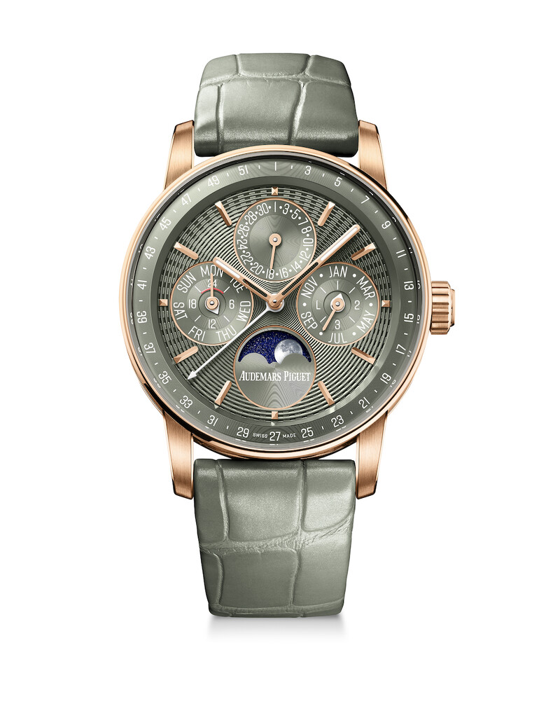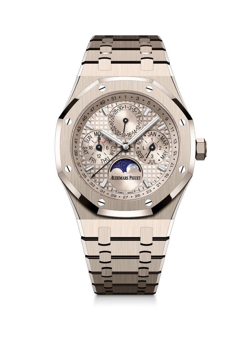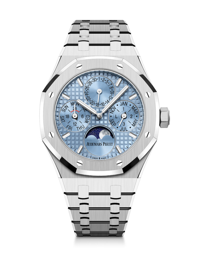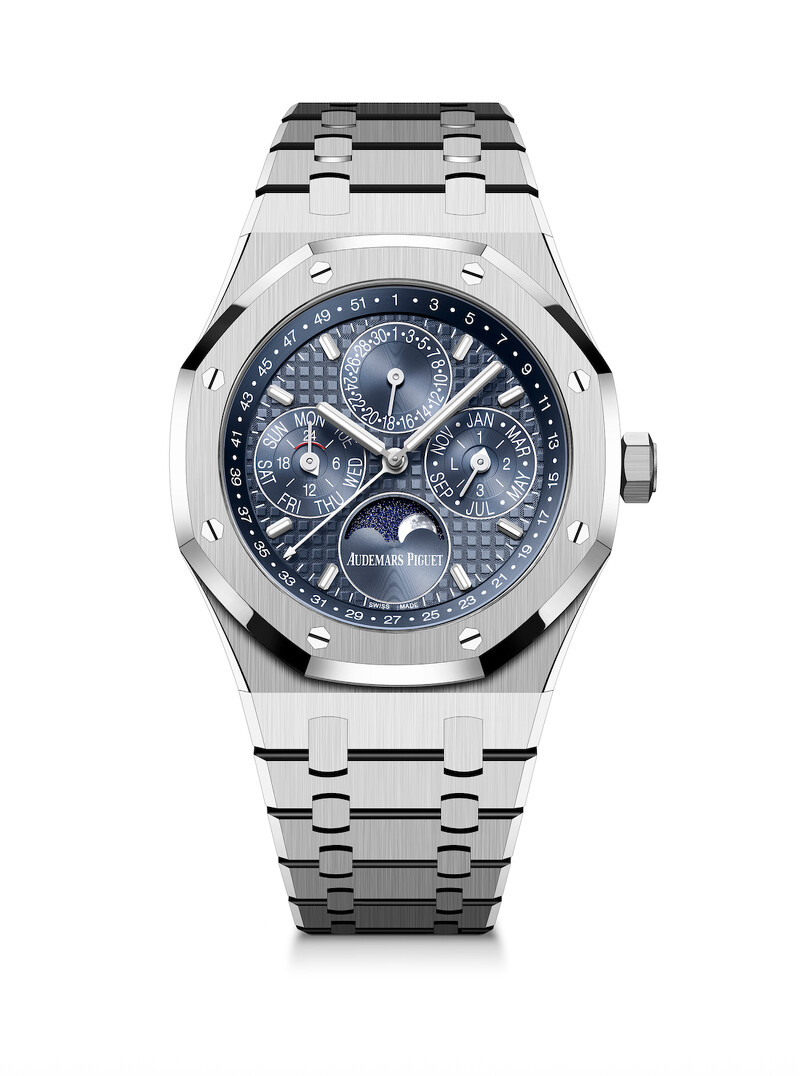 包括報時與陀飛輪,做為高級鐘錶最有指標性的三大複雜功能(Grand Complication)之一,萬年曆(Perpetual Calendar,可指示日期、星期、月份、年份、分辨大小月,能更進一步顯示閏年的為大萬年曆),是天文及時間的完美結合,它也以多項相關首創製錶工藝,成為品牌歷程裡別具意義的存在。AP 的萬年曆在今年又再造,推出歷經五年研發,擁有五項專利的全新自動上鍊萬年曆機芯,Caliber 7138將上鍊與調校整合於單一錶冠:第一段順時針調校日期、逆調月份並同步閏年,第二段調時,自第二退回第一段則是順調星期、逆調月相,操作起來簡單直觀,全然改寫過去的機制。此機芯率先搭載於三款週年紀念限量41毫米腕錶亮相。