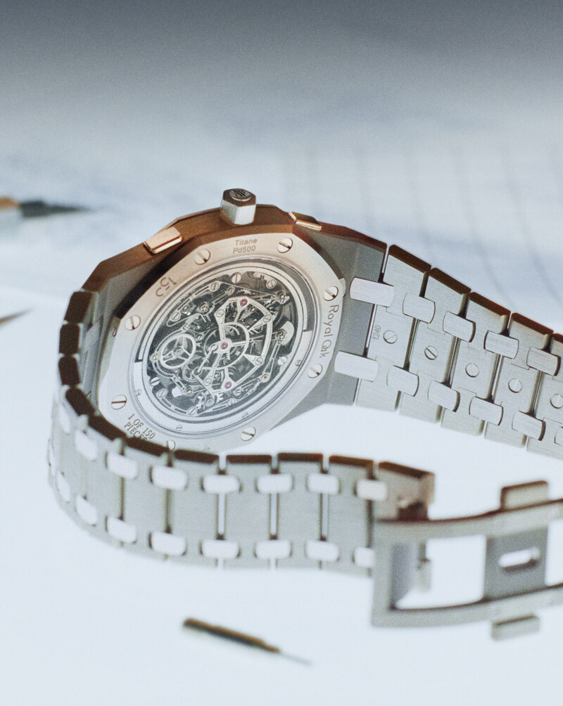 回溯1930年代的經濟政治動盪,期間品牌年銷不超過15枚時計的低潮,反而促使工匠進一步專精 open work 鏤空金雕,1970年代初更設立藝術工坊。能將機芯機械美毫無保留得呈現眼前,須在其運轉穩定的前提下,最大程度地除去金屬面並為之修飾雕刻,需要掌握多方領域專業,令鏤空成為 AP 極具代表性並受到推崇的精湛技藝。新款的皇家橡樹系列萬年曆鏤空腕錶150週年限量版,其設計靈感便來自 AP 博物館展出的歷史懷錶(編號25729),繁複鏤空錶盤展現機械古典之美(搭載傳奇 Cal.5135 機芯,錶款亦是其最終舞台),與鈦金屬和塊狀金屬玻璃打造的錶殼及錶鍊,在美學詮釋上揉合優雅經典、前衛當代,創造出強烈對比。