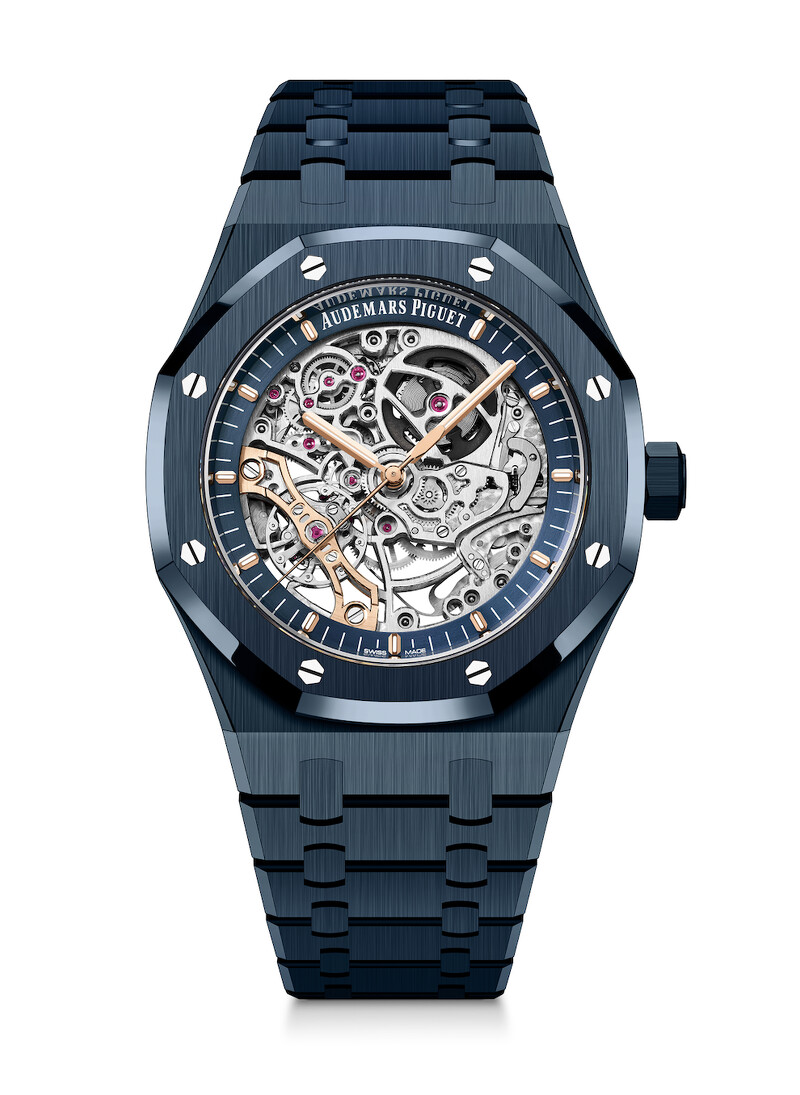 功能 :小時、分鐘及中央秒針顯示。 (3132自動上鏈機芯) 錶殼 :「雲夜藍50」陶瓷錶殼,搭配經防炫光處理藍寶石水晶玻璃鏡面與底蓋、鈦金屬底蓋框架,防水深度高達50米。 錶面: 「雲夜藍50」內錶圈,搭配螢光塗層18K玫瑰金時標與Royal Oak皇家橡樹指針。 錶帶 「雲夜藍50」陶瓷錶鍊,搭配鈦金屬AP字樣折疊扣。