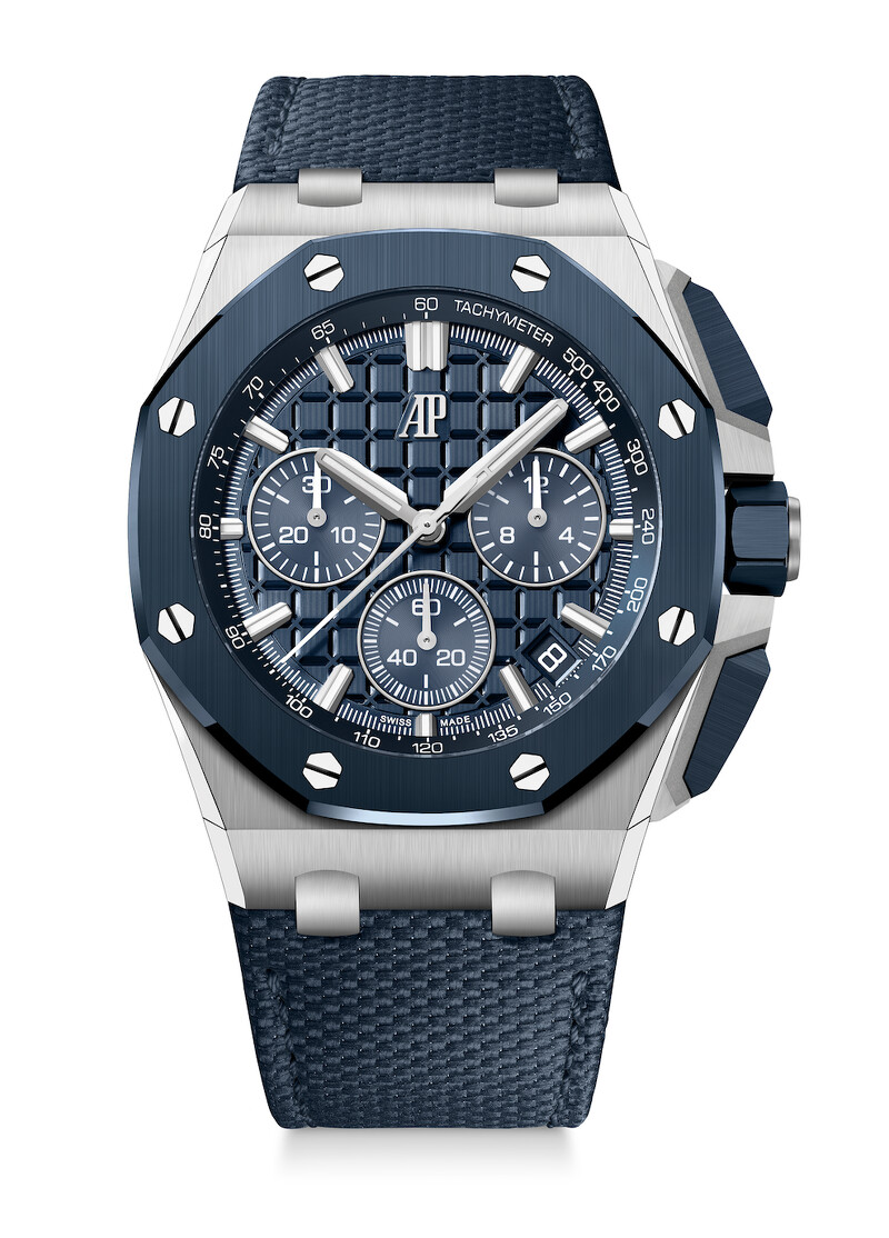 功能: 計時碼錶搭載飛返功能、小時、分鐘、小秒針與日期顯示(4404自動上鏈機芯)。 錶殼 :「雲夜藍50」陶瓷錶殼,搭配經防炫光處理藍寶石水晶玻璃鏡面與底蓋、鈦金屬底蓋框架、「雲夜藍50」陶瓷按鈕、按鈕護橋、旋入式錶冠,鈦金屬錶冠細節,防水深度高達100米。 錶面: 「雲夜藍50」「Mega Tapisserie」超大型格紋裝飾錶盤,搭配「雲夜藍50」計時器,螢光塗層18K白金Royal Oak Offshore皇家橡樹離岸型指針及時標、「雲夜藍50」內錶圈。 錶帶 「雲夜藍50」陶瓷錶鍊,搭配鈦金屬AP字樣折疊扣。