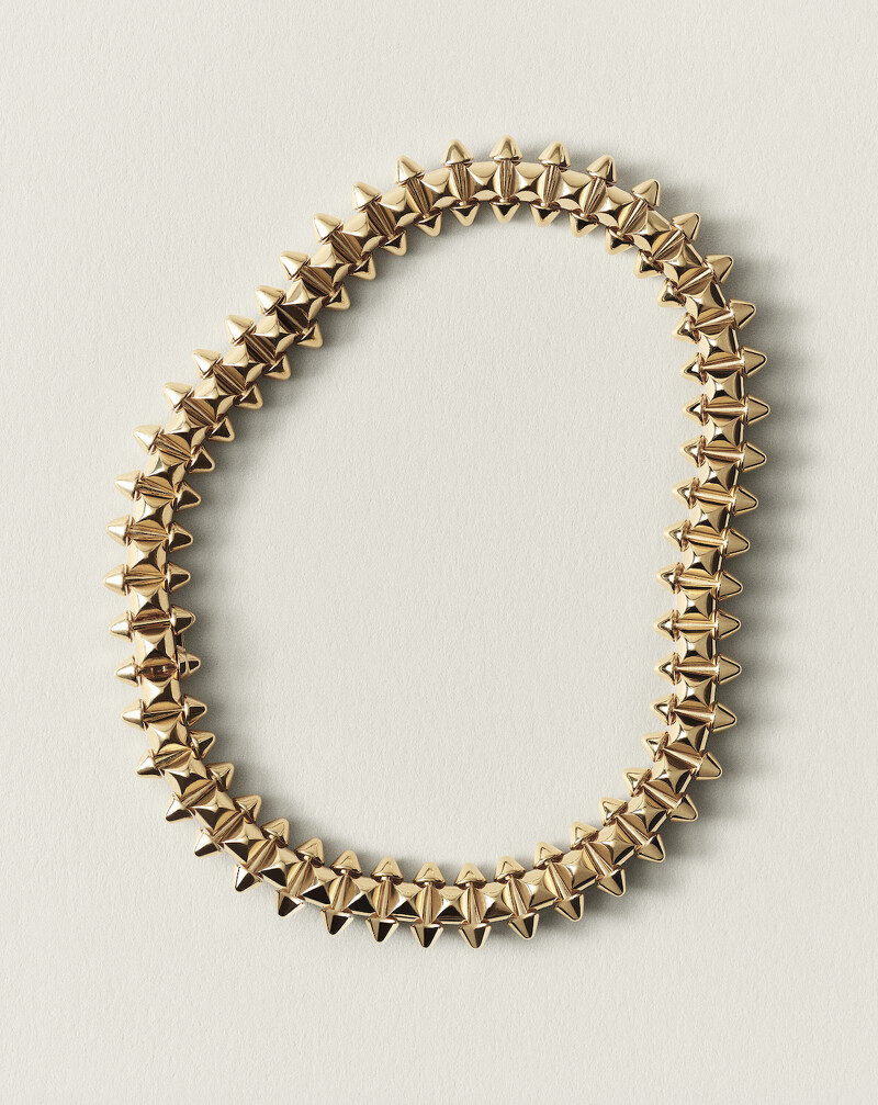 亮點之作當屬超大型款:尺寸放大的黑色縞瑪瑙飾釘搭配18K 黃金圓珠,為手環、statement 短項鍊和獨特時髦的「三行」戒指,注入格外引人注目的張揚氣場。