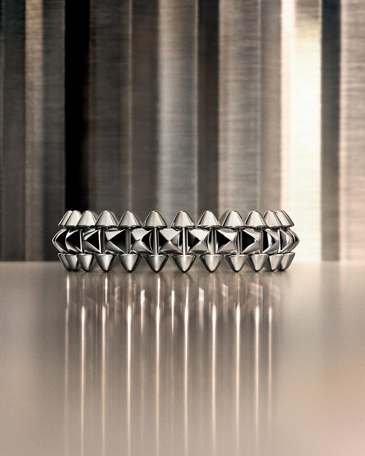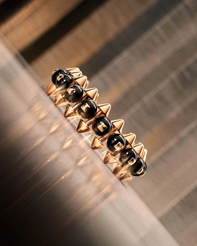 Clash 設計元素的定調並非刻意反骨。有意識的風格挑選,源自卡地亞不隨波逐流,打破常規的精神「傳統」,像是,自20年代起,汲取從工業領域轉化而來的設計,以及1920至1930年代之間,也將飾釘、巴黎飾釘(Clous de Paris)先鋒運用於腕錶與配件作品之上;或是以大量的圓珠(Beads)裝點在珠寶創作中,創造出豐盈輪廓與潤澤光影的獨到美感。Clash de Cartier 擴展創意維度,將飾釘(圓錐尖刺狀)、巴黎飾釘(呈金字塔型底座的方形釘)或圓珠,三者幾何結合、變化,而其中的工藝概念技術更是亮點。