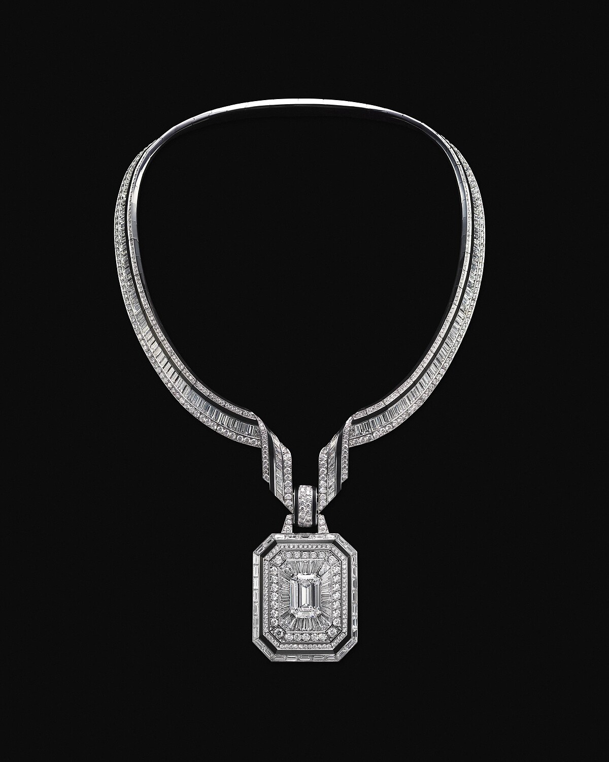 靈感源自品牌歷史檔案,中央鑲嵌一顆10.01克拉祖母綠形切割鑽石的墜飾(可卸下另作戒指配戴),呼應芳登廣場的八角形輪廓。白金、鑽石與黑色漆面,單色系更顯幾何造型的視覺力量,項鍊由多重鉸鍊銜接而成,活動流暢貼合。