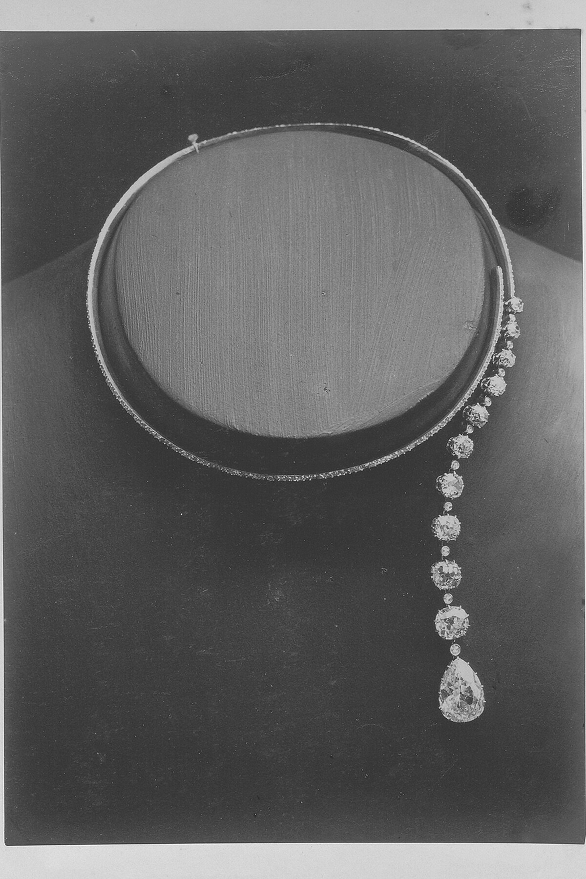 鋪鑽項鍊,白金材質,黑漆飾邊。沿襲多重式配戴的傳統工藝。1,107小時工時