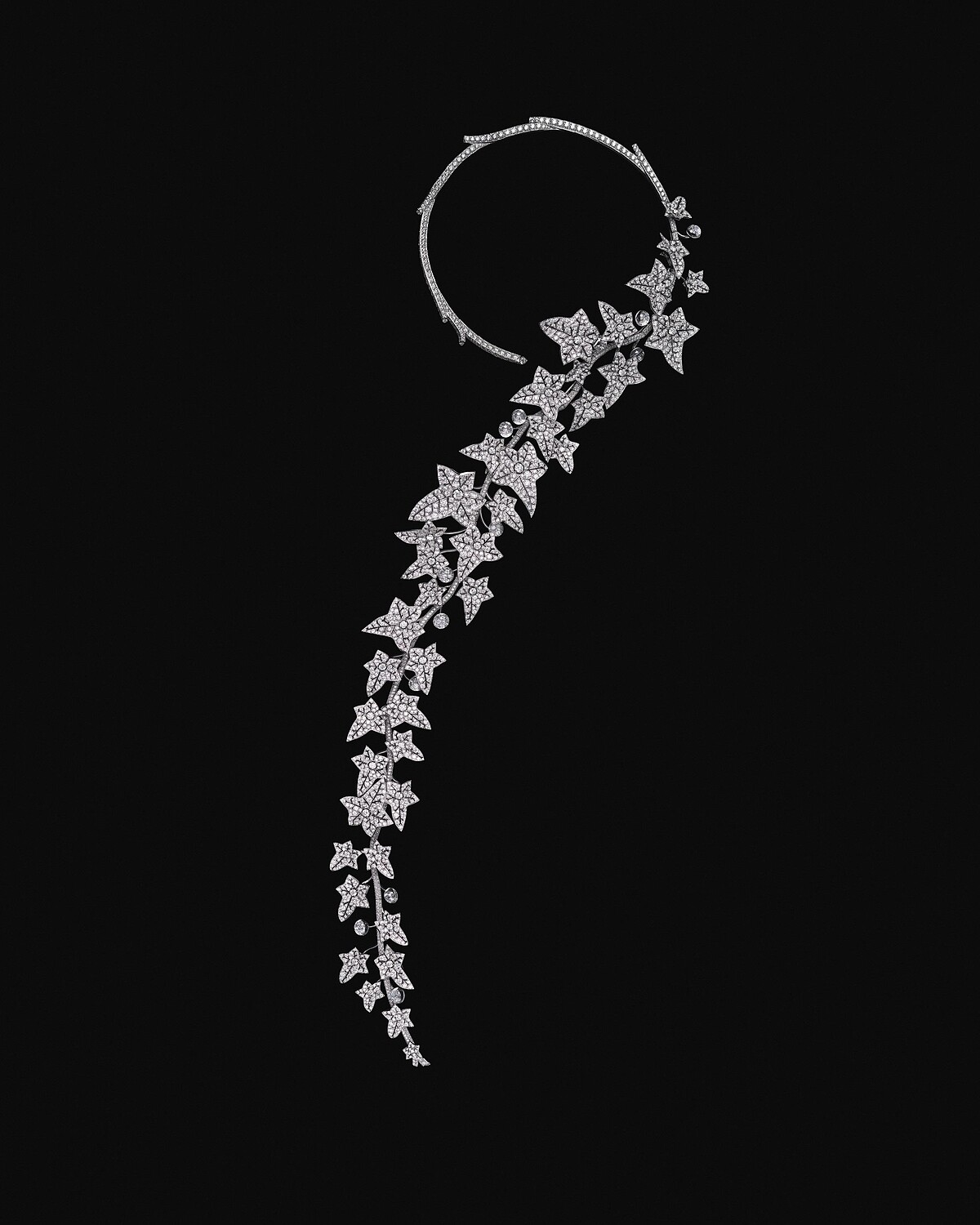 像是恣意攀長於身的鮮活藤蔓!靈感為品牌歷史檔案中的首款Question Mark問號項鍊設計手稿(當時並未製作生產),由多個常春藤元素構成,可轉換拆解為:長或短版項鍊、頸鍊、胸針/髮飾。工藝驚喜在於水晶雕琢果實、葉片,及「輕顫結構」所帶來的細微動態。