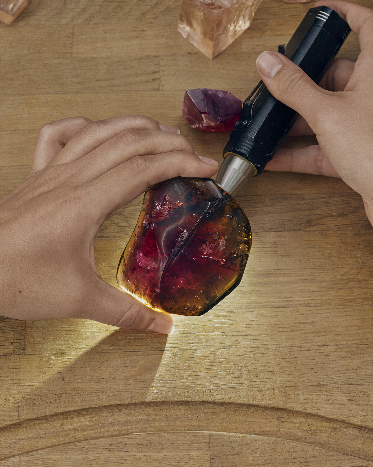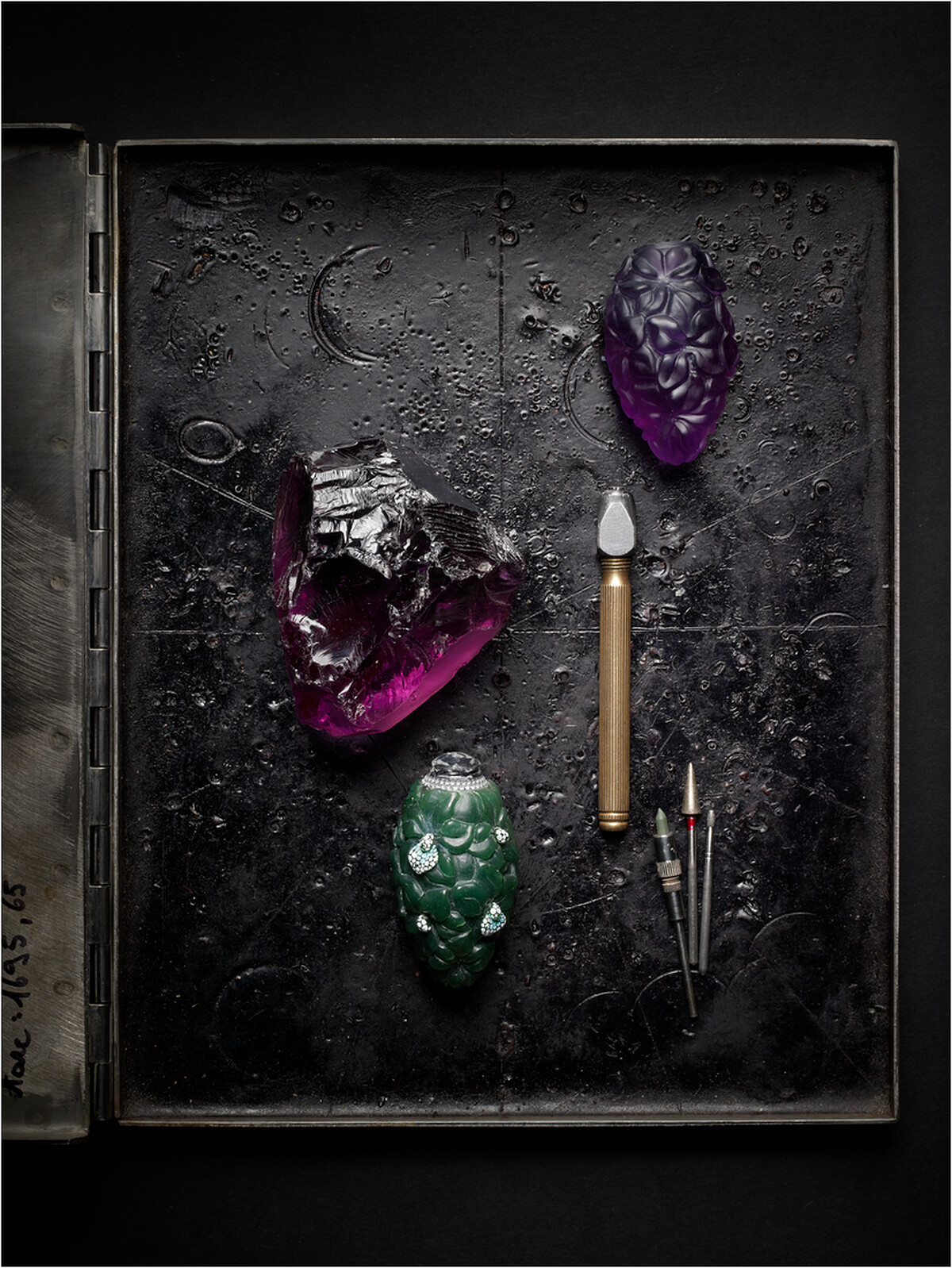 雕刻創作從寶石的搜羅開始。不限於硬石、化石、木化石及矽化松果、少有的天然材質等可能性,也許需要親自飛往美國土桑(Tucson) 或法國 Sainte-Marie-aux-Mines 礦脈尋找;接著,雕刻師或根據設計挑選寶石,或從原石本身的特性出發,再為其量身打造出最能襯托自然之美的造型設計。