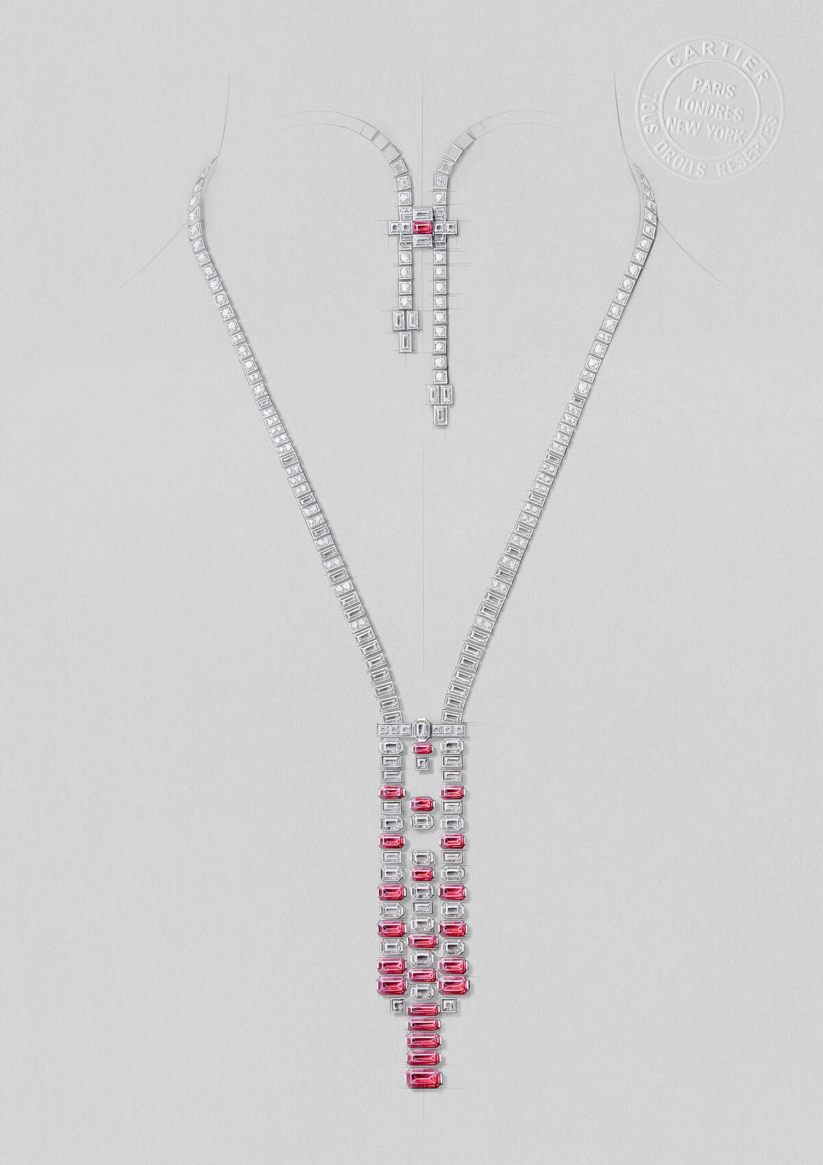 由採用祖母綠形切割、水平橫式擺放鑲嵌的紅寶石,以及方、長方梯形和圓形明亮式切割的鑽石,彼此相互映襯,共譜出流暢垂墜感的抽象構圖。前方的幾何輪廓紅寶石與鑽石吊墜成為視覺張力中心:精密計算佈局,以不規則交錯排列創造出規則和諧,並製造兩處鏤空,「虛實空間」更彰顯線條與光影的節奏感;項鍊背面的搭扣,可於兩條鍊帶間滑順調節,賦予項鍊調節長度的靈活性。