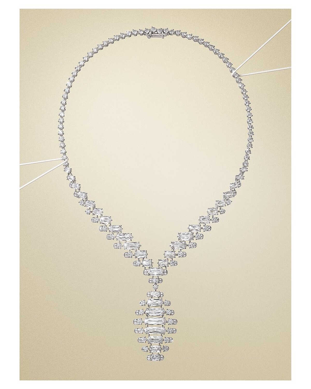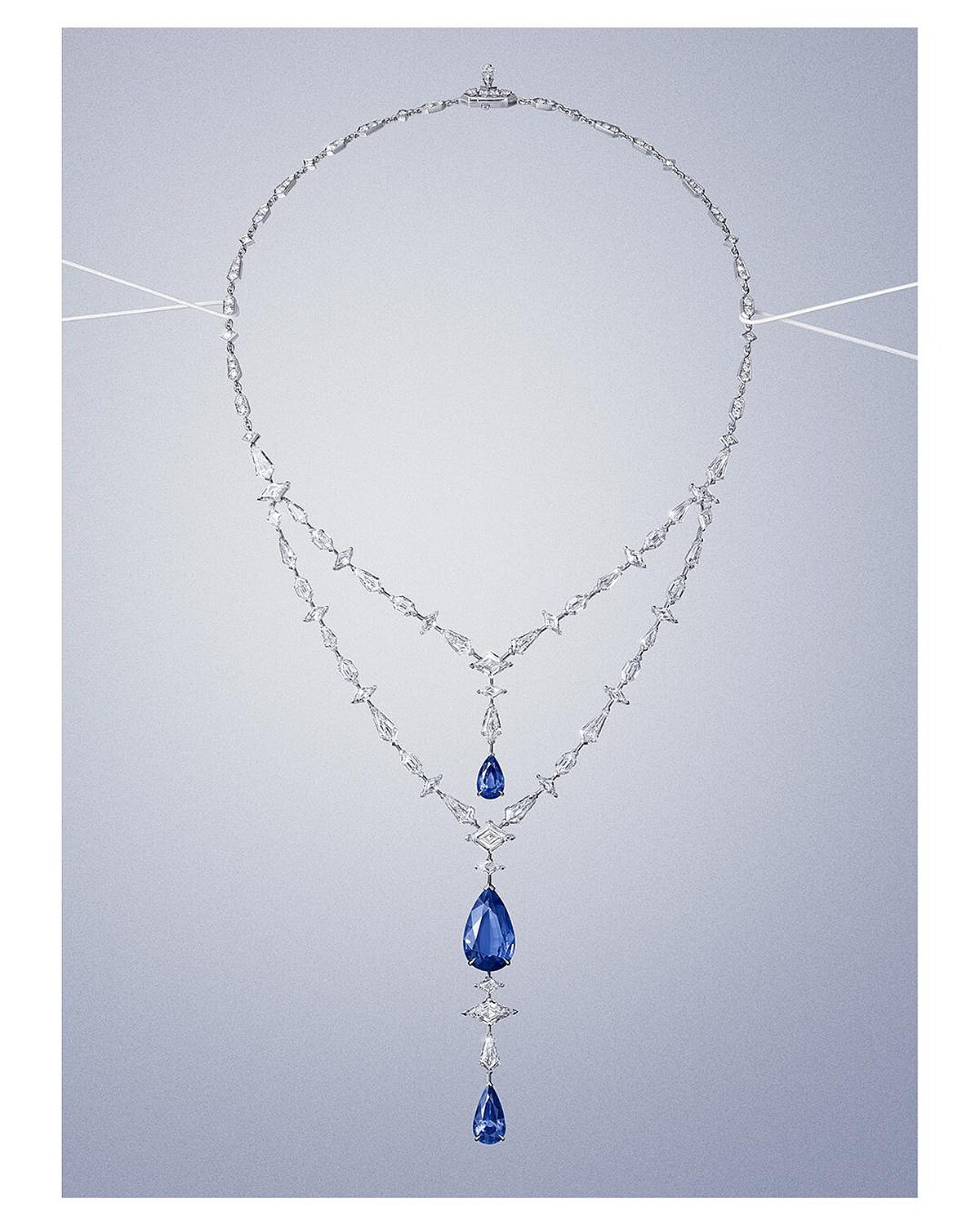 此款作品的簡約精緻感恰如其分,沒有任何一絲多餘筆觸,以最少量的線條,卻能勾勒出最準確到位的珠寶工藝和優雅美學。首先是吸引目光的三顆總重16.59克拉的馬達加斯加梨形藍寶石,由上至下平衡綴飾焦點,其成行排列的方式,同時構築了項鍊結構上的微妙佈局。以它們為核心,向外散出鳶形、菱形與圓形明亮式切割鑽石錯落鋪排而成的鑽石線條,令本身已像是自帶層次配戴感的「雙鍊」項鍊,韻律動態再提升更高層次。