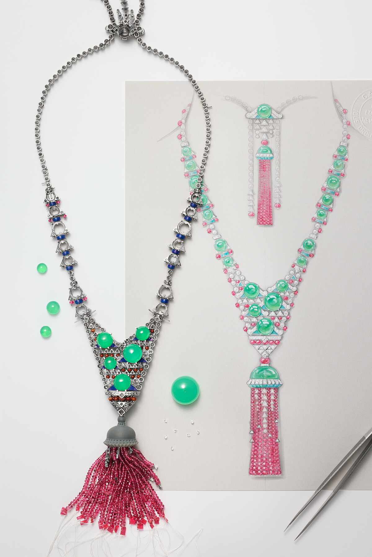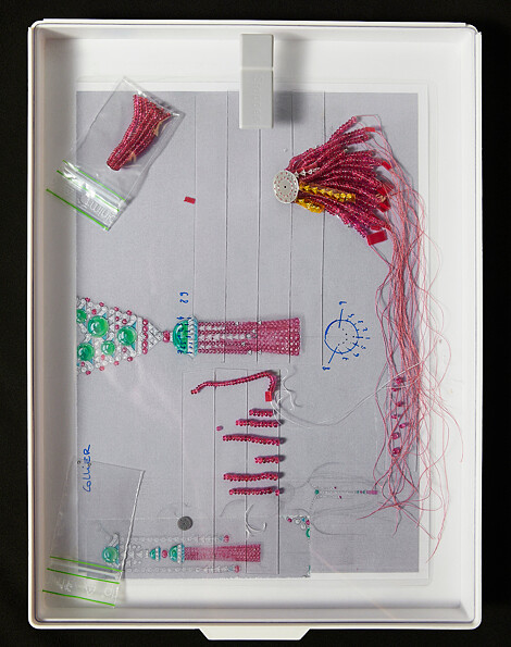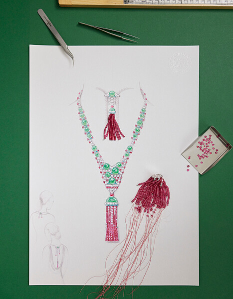 作品體現卡地亞色彩與形狀的獨到搭配。綠、紅與白的組合,自20世紀初起便已是品牌標誌性的調色元素,不同色彩的寶石再各自選以不同的車工形狀、鑲嵌型態等手法,像是,凸圓形綠玉髓、綠玉髓圓珠、尖晶石圓珠、方形切割和圓形明亮式切割鑽石,在一切看似「對立」之間營造出別出心裁的平衡美感。正和背面各飾有一枚流蘇,下擺串珠的優雅撥動回應了設計靈感來源:水母於洋流中漂流的靈動姿態;此外,後背流蘇同樣具備轉換珠寶工藝,能用於調節長度。