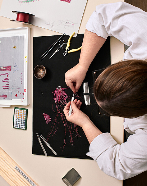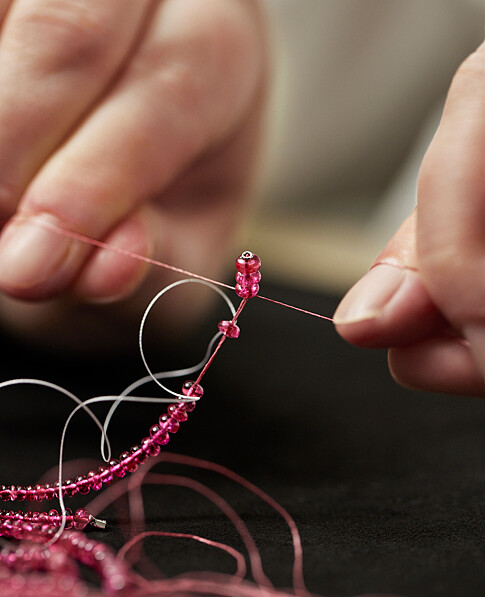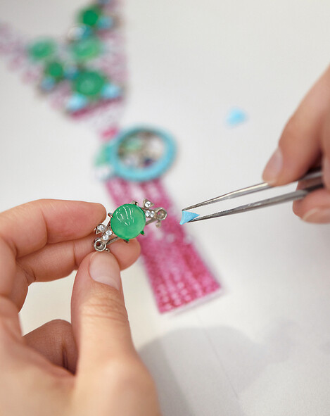 過程中,作品會由寶石雕刻師、珠寶設計師、鑲嵌師、寶石工匠與拋光師,進行來回多次的共同參與討論及逐步調整,從無到有,通常要花上大約兩年;而單就寶石雕刻來說,每件平均需耗時至少400小時才得以完成。