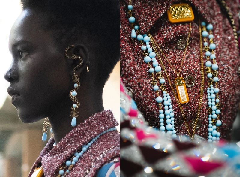 溫暖繽紛的民族色調與閃亮珠飾及刺繡亮片交織成一幅幅絕美的優雅意象,濃厚的塞內加爾風格透過多彩豐富的色調展現具有活力的文化底蘊,其中塞內加爾的獅子國徽與香奈兒女士的獅子座不謀而合,令人玩味。